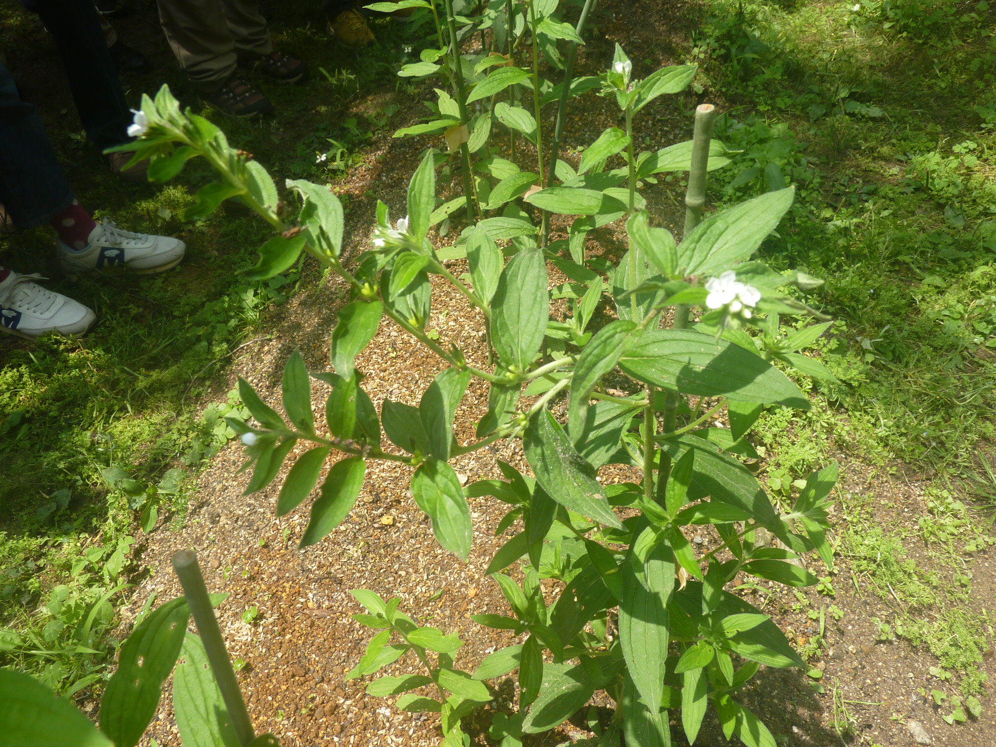 丁度、開花の季節、枝先に小さな紫ではなく白い花が数輪咲いていました。ムラサキは絶滅危惧種で、紫根は紫の染料となり、ほとんどが栽培されていますが育てるのが大変難しいようです。また薬草としても紫根から抽出されるシコンエキスはボナギノール等の薬品名でも知られています。さらに付け加えるならば紫根は土中にあるうちは紫でなく、土から離れてはじめて紫色となるそうです。萬葉歌には「茜さす紫野(むらさきの)行き 標野(しめの)行き野守(のもり)は見ずや 君が袖振る」額田王、の他9首。