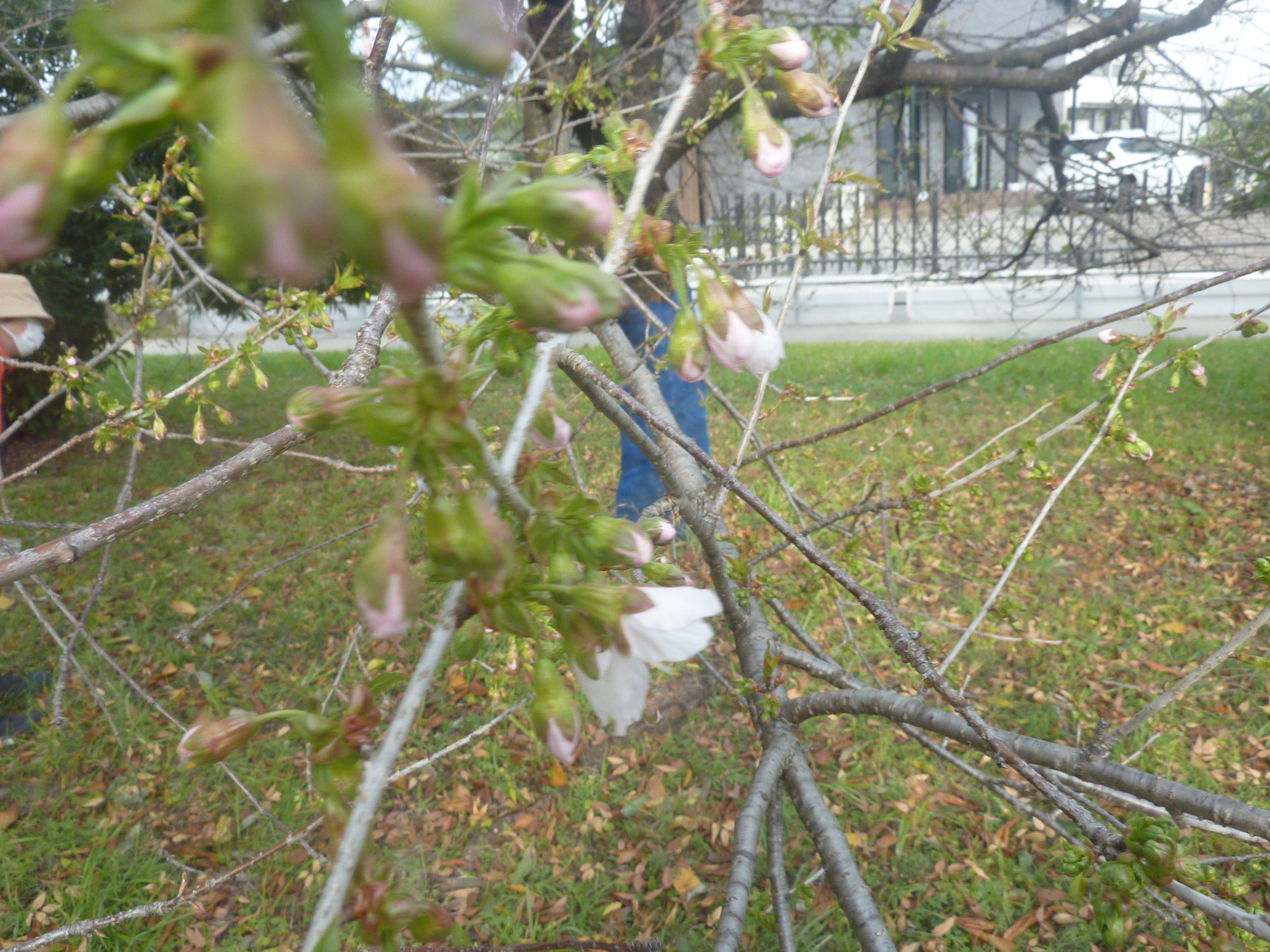 頂上展望台までの途中では、ヘラシダ、北限の自生地といわれるカギカズラ、ヤマネコノメソウをじっくり観察。 クスノキの大木では写真のように7人が手をつなぎ胴回り調査が始まりました「10m以上はありますね」。展望台では生憎の悪天候にて視界が悪く残念でしたが、眼下の桜はしっかり見えていました。