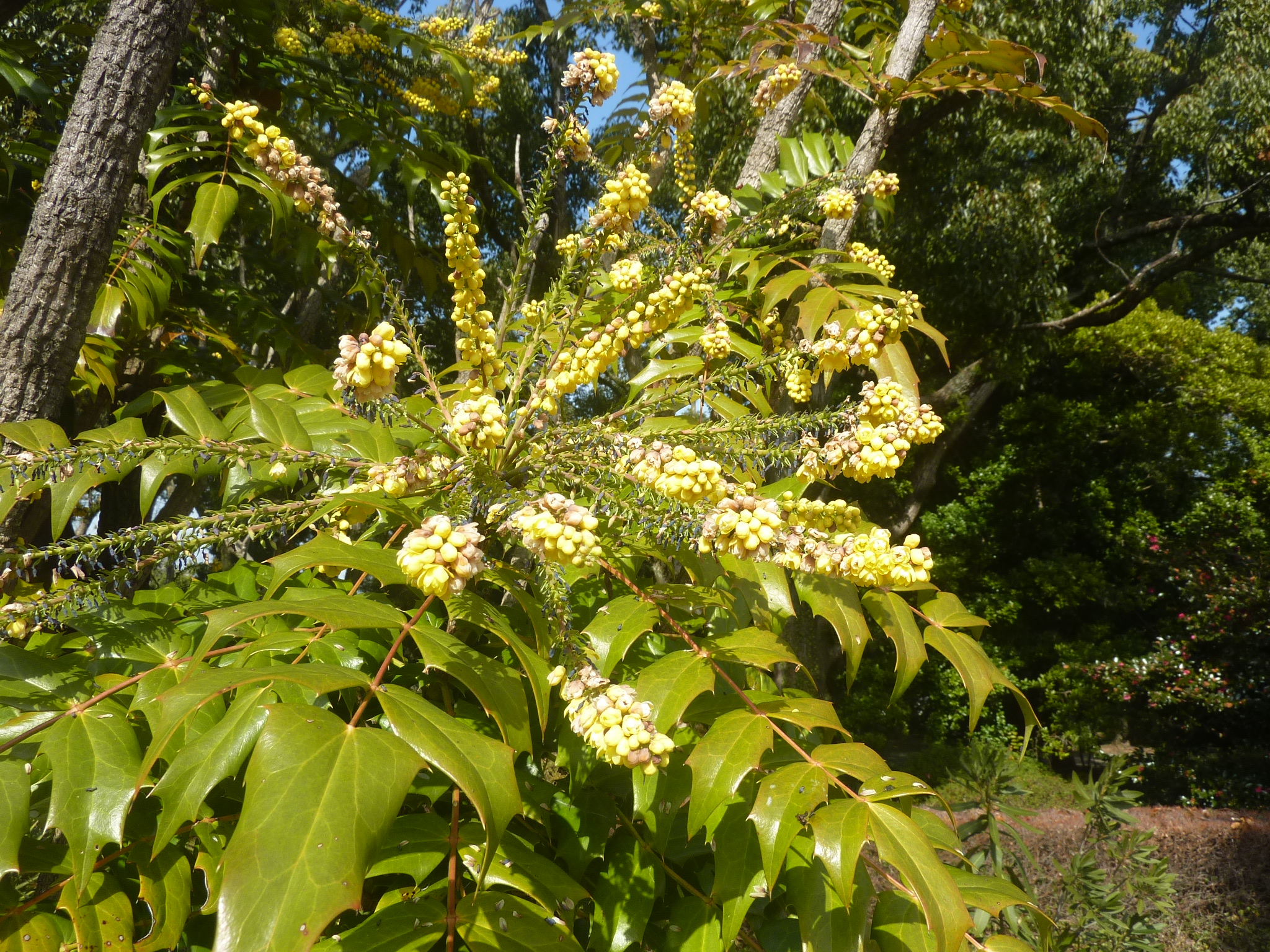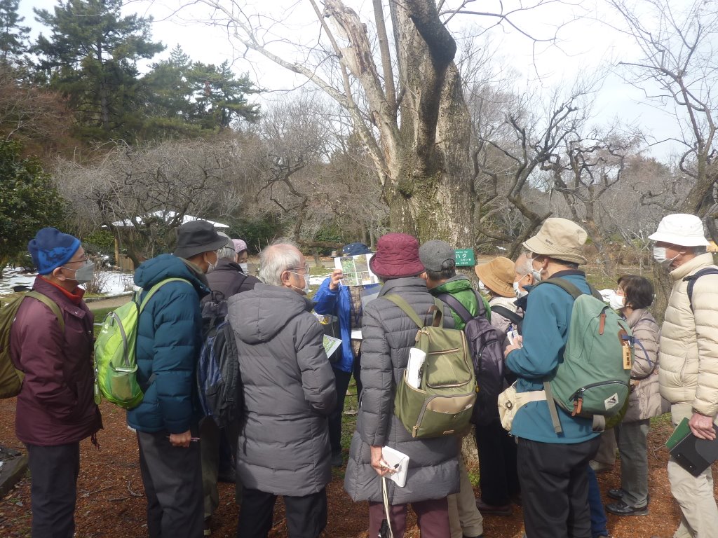 午後は、毎水曜日に行われている「水曜ガイド」に参加しました。私たちと常連さんなどで約30名がガイドさんの後をゾロゾロとついて行きました。タイサンボクの花芽、菰をかぶったソテツ、黄色い花を付けたヒイラギナンテンの一種などを観察。チューリップの球根を3万球植えている、クスノキの並木は200mあり、開園当初からあるので100年経っているなどの説明がありました。つばきのコーナーでは、多くの種のツバキは、ヤブツバキ・ユキツバキという野生種から派生したモノとの説明がありました。日本中の野生の植物を集めたという「植物生態園」の説明がありました。コウヤマキ、クロモジ、コクサギなどの樹木、午前中に見たセツブンソウもこのコーナーにあり日本固有種とのこと.。続いて、長ひょろい雄花が咲いているツノハシバミ、マンサク、葉のまわりが白くなったクマザサ、アリドオシ(一両)の赤い実、ダンコウバイ、冬に葉があり夏に落葉するオニシバリ、ミツマタの花などを観察した。最後にオニグルミの猿の顔をした葉痕を観察して、水曜ガイドを終えました。花の少ない時期ですが、二人のガイドさんのお陰で、楽しい観察会が出来ました。(M.A/写真M.K)