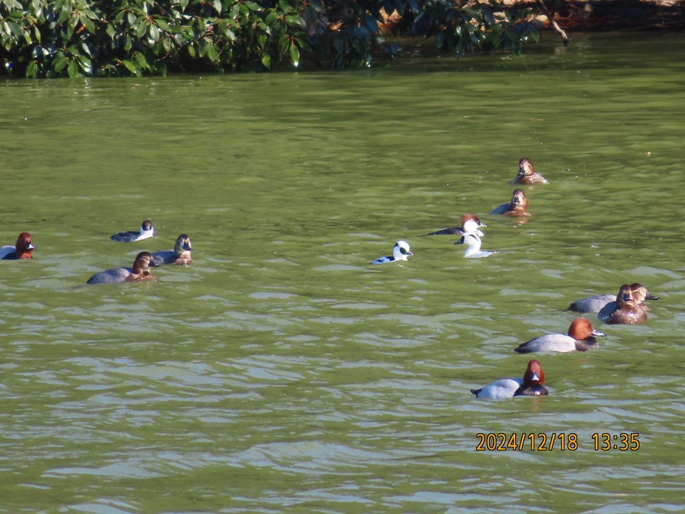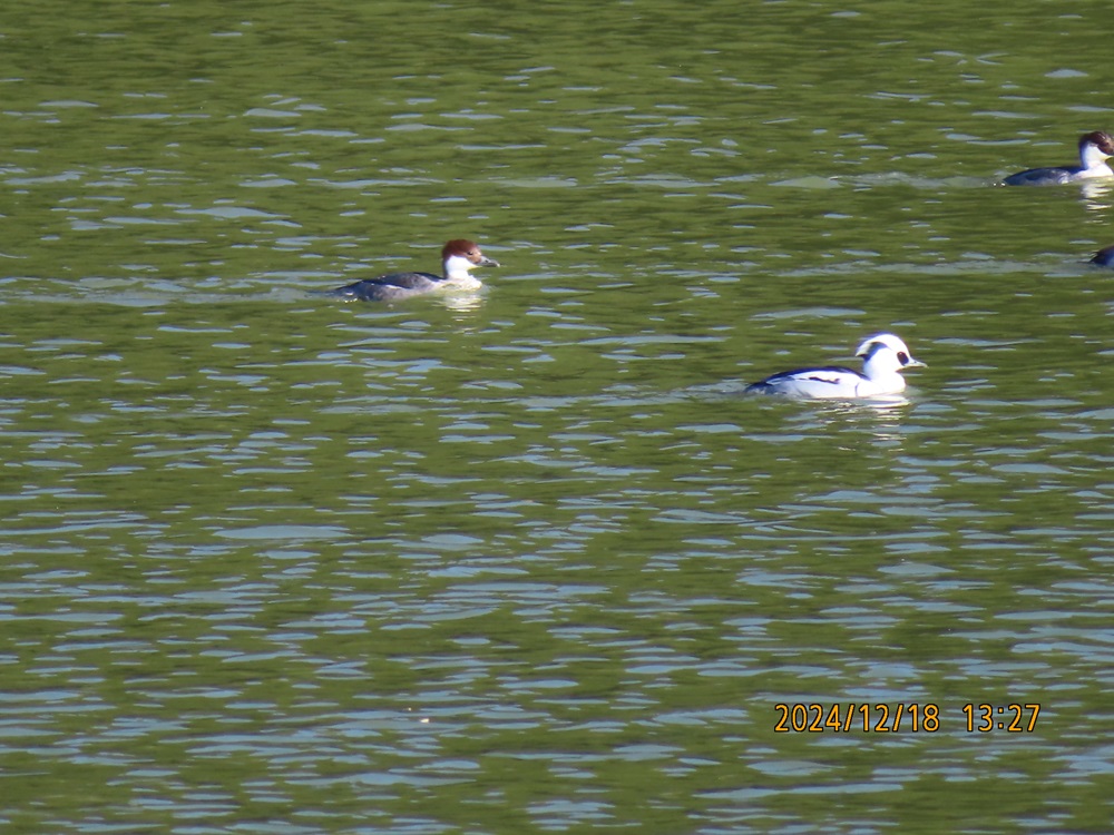 「xxxアイサ」とはガンカモ科のアイサ属の総称。潜水して魚を捕るのが得意なのでよく潜る。クチバシが細長くのこぎり状の歯状突起がある。日本では普通3種が見られ冬鳥として渡来する。(カワアイサ、ウミアイサ、ミコアイサ)ミコアイサは漢字で書くと巫女愛沙と書きオスの白い姿を巫女の白装束に見立てたとの説があります。(M.S 写真K.T)