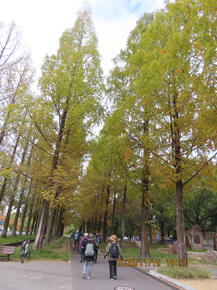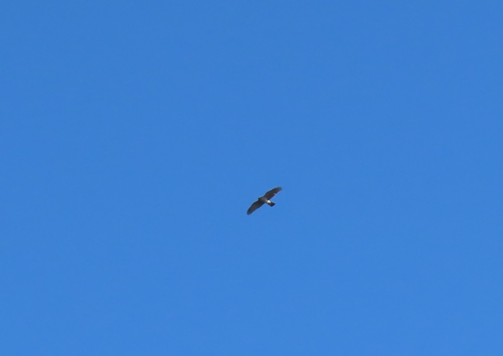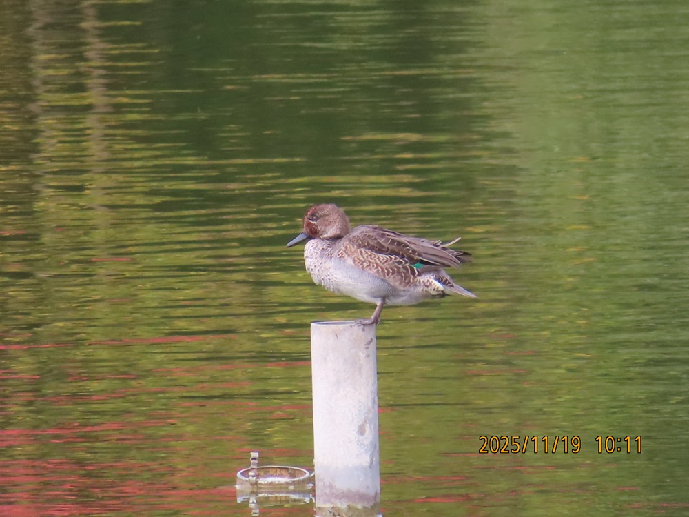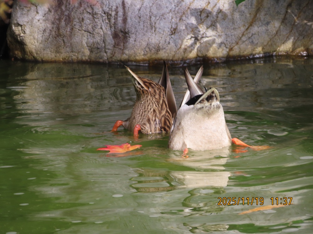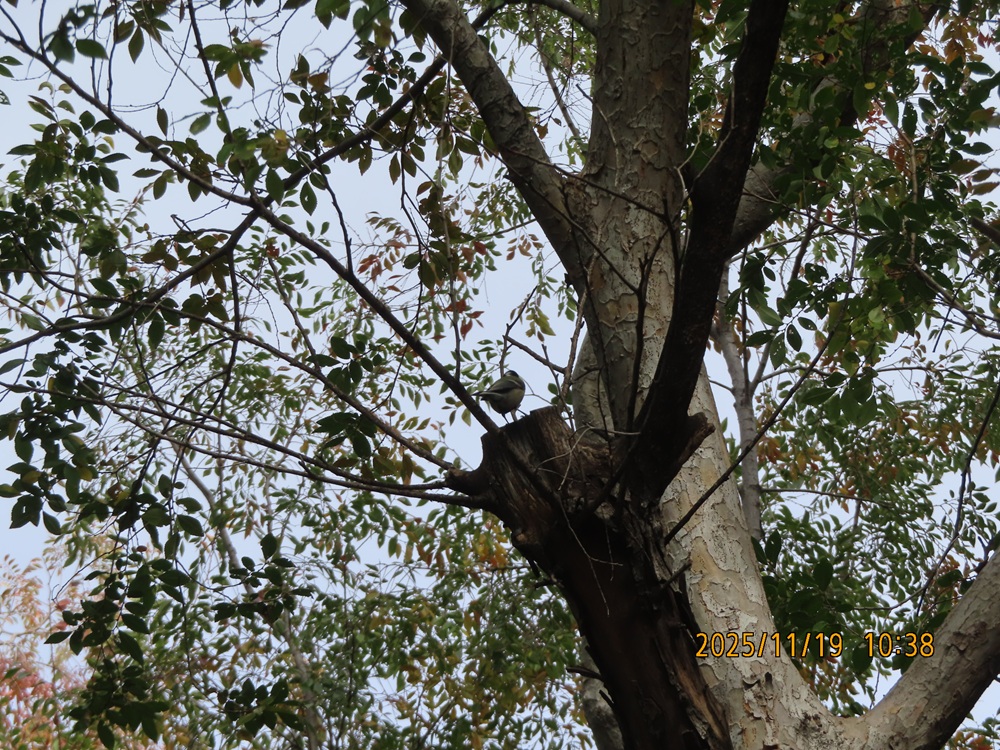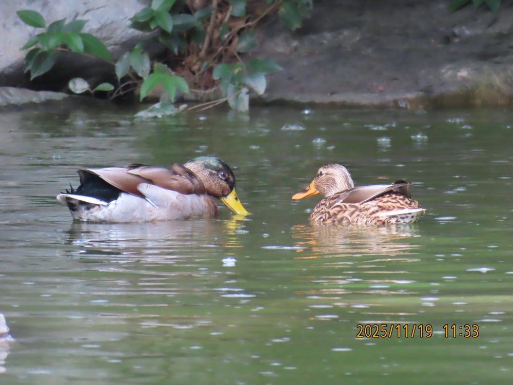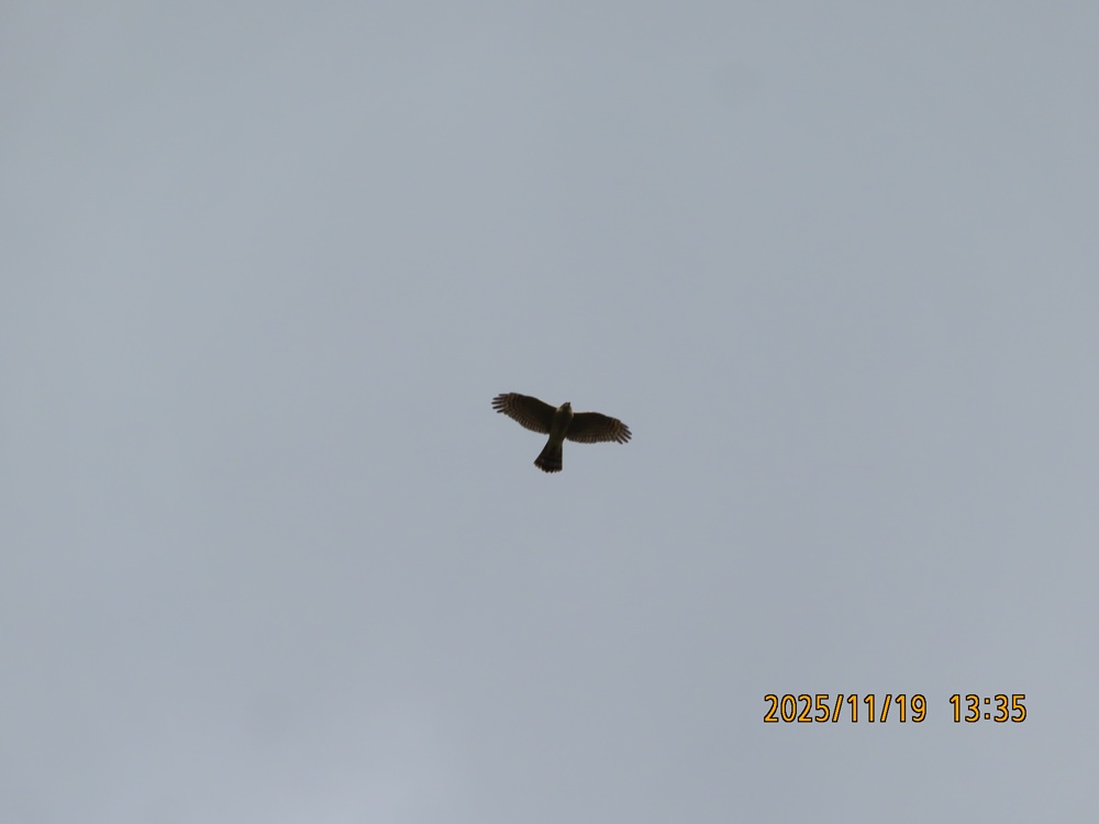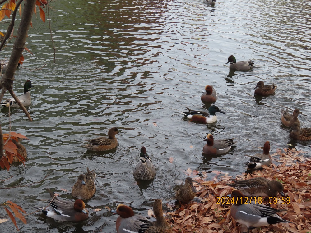 天気予報では12月の気温になるとのことで心配でしたが、幸い風もなく観察には良い天気でした。公園に入りまず、簡単に大池で渡ってきたカモの観察。ほぼ例年並みのカモの種類を確認して 森の中を風車の丘に向かいます。聞こえるのはヒヨドリの声のみ。山のエリアでもシジュウカラやメジロ、コゲラなど普通種しか見られません。現地のカメラマンの話では朝早くに鷹が出たので小鳥たちは隠れているとのこと。日本庭園の方に近づくと換羽中のマガモのペアが近くで見られました。昼食後も庭園の池にはアオサギやコサギがいるもののお目当てのカワセミは見当たりません。せせらぎの小川近辺も鳥影が薄く、大池に戻り常連のカモ達を観察。冬鳥のジョウビタキやシロハラにも出会えず残念でした。鳥合わせのときに上空をハイタカが飛んでくれたのがラッキーでした。