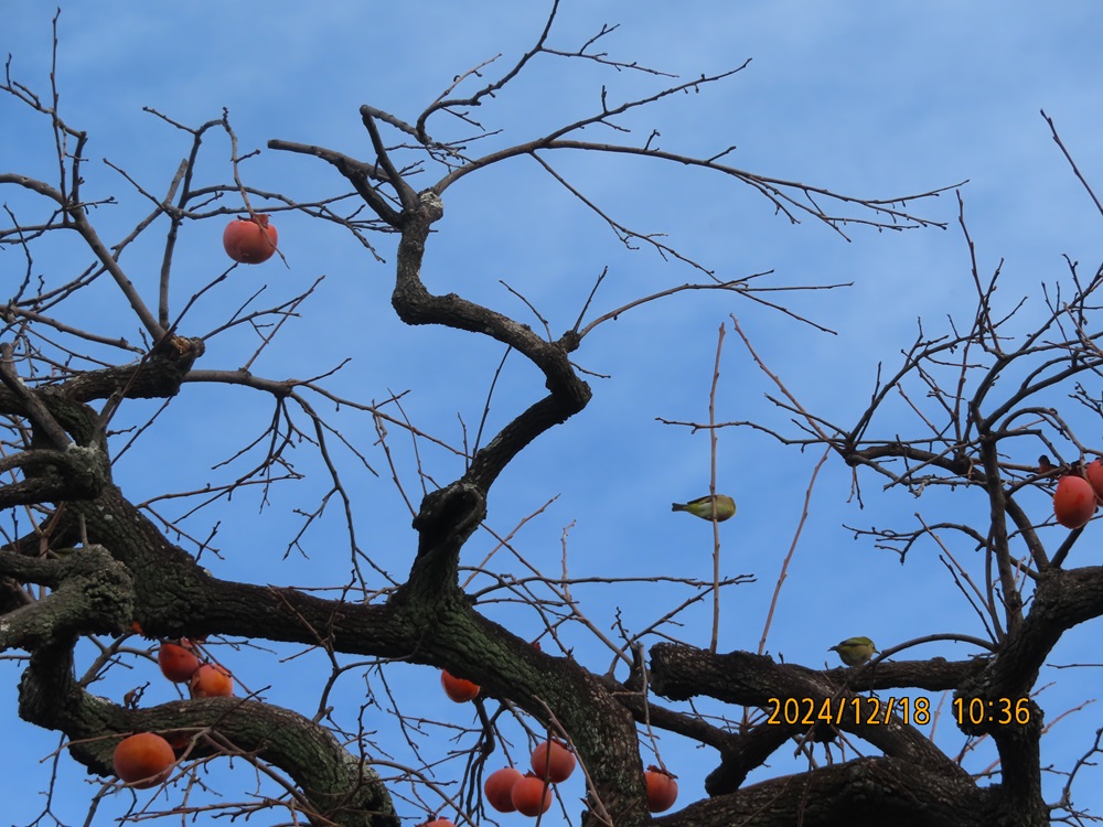 朝からどんよりした曇り空、でも予報では日中の降雨は心配なさそう。スタート地点の法道寺境内、そしてその裏の池へと進めるが、全く鳥の気配なし、毎年現れるカモ類も姿が無い。今年は暑さが長かった所為か 鴨の渡りが遅いのだろうか・・・でも池では赤トンボ(猩々トンボ?)の多くのペアが水面に産卵の最中。暫くは野鳥を忘れてトンボ観察となった。 集落に入ってもやはり鳥の気配はなく、庭先の赤くなった柿の実も静かだ。 しかしようやくタラノキの実に集まるメジロ、スズメ、ヒヨドリの出現に、ホッとする。