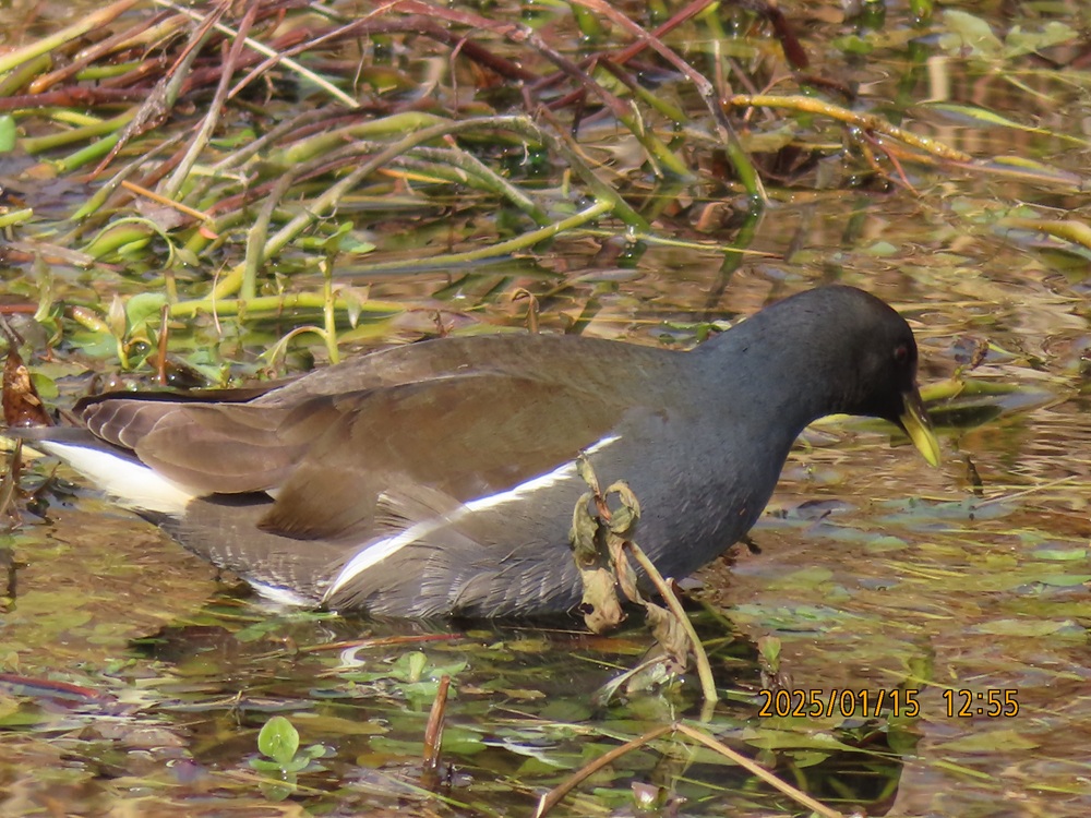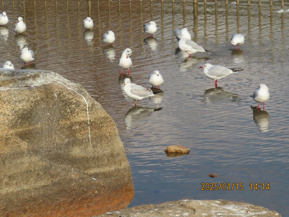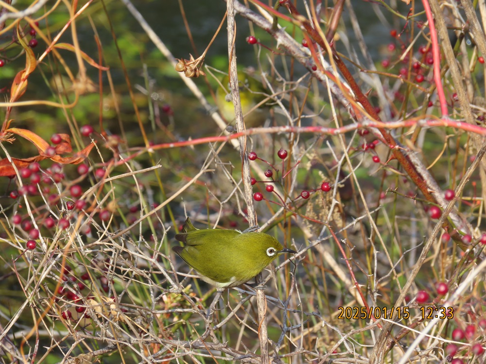 赤川地区では、この時期よく見られている冬鳥のベニマシコを期待して探しましたが見つけられませんでした。メジロの群れが赤い実を求めてやってきてかわいい姿をじっくり見せてくれました。バンやオオバンも見ることができました。ツグミやシロハラも例年よりは数が少なかったので、今年の冬鳥は全般的に低調のようです。城北公園ではおなじみのユリカモメの群れやカワセミが全身よく見える位置でそのきれいな姿を堪能させてくれました。鳥合わせでの観察種も37種と多くまずますの探鳥会でした。