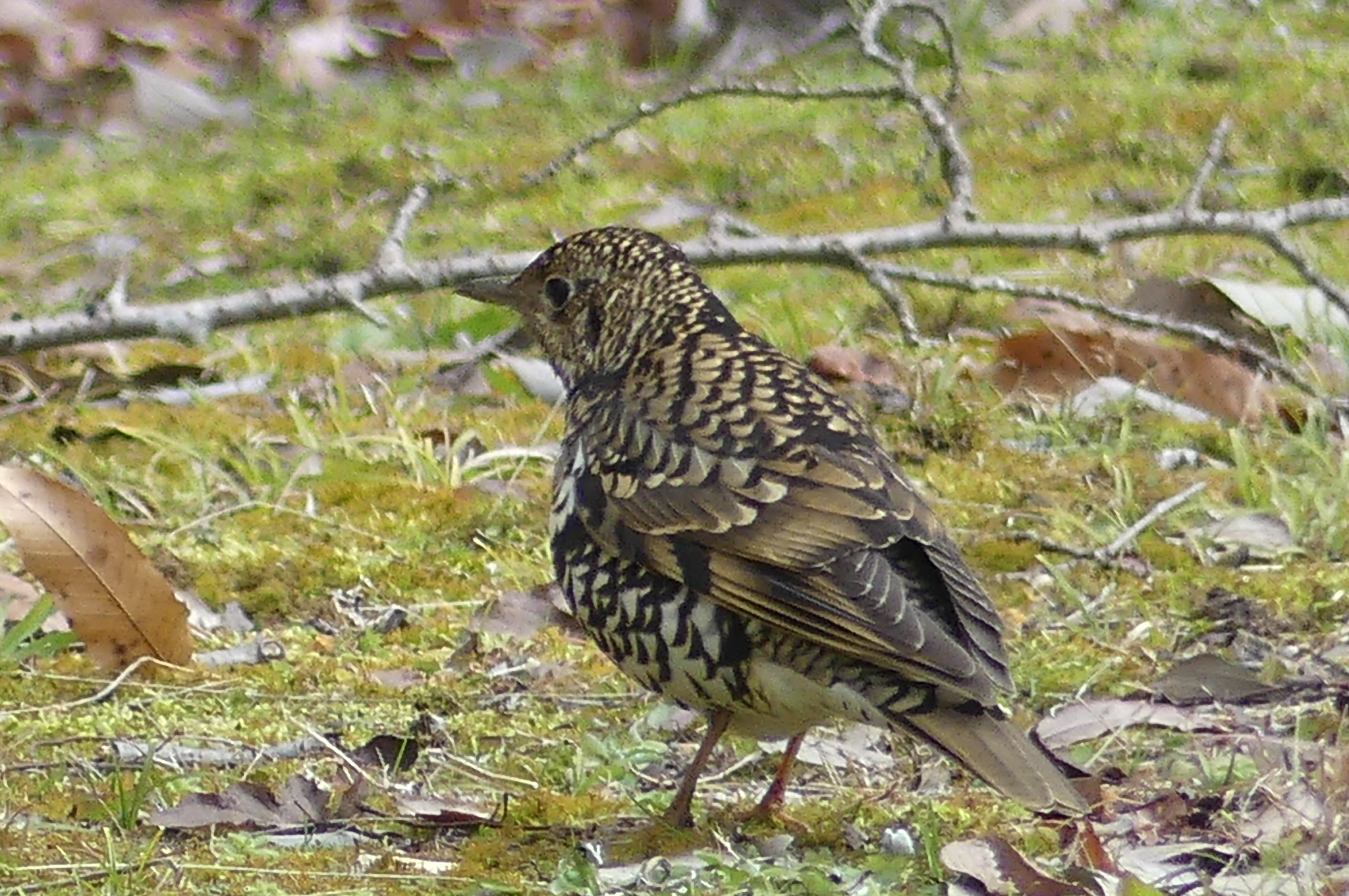 トラツグミは全長30cmで24cmのツグミよりも大型です。日本では留鳥又は漂鳥として生息します。黒褐色の斑模様を持ち、夜の森でヒー・ヒョーと不気味な声で鳴きます。そのため鵺(ぬえ)と呼ばれ気味悪がられることもありました。一度スマホで検索して聴いて見てください。「トラ」で始まる名前の野鳥はトラツグミとトラフズクです。いつかトラフズクにも会えるといいですね。(M.S 写真 M.S & Y.S)