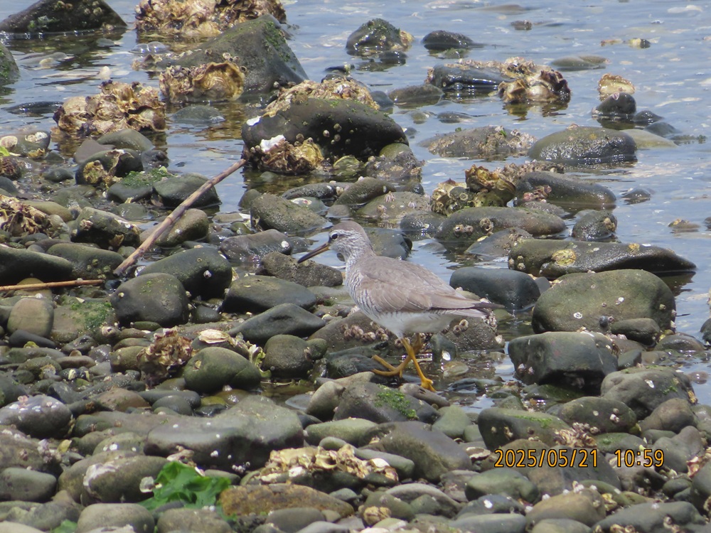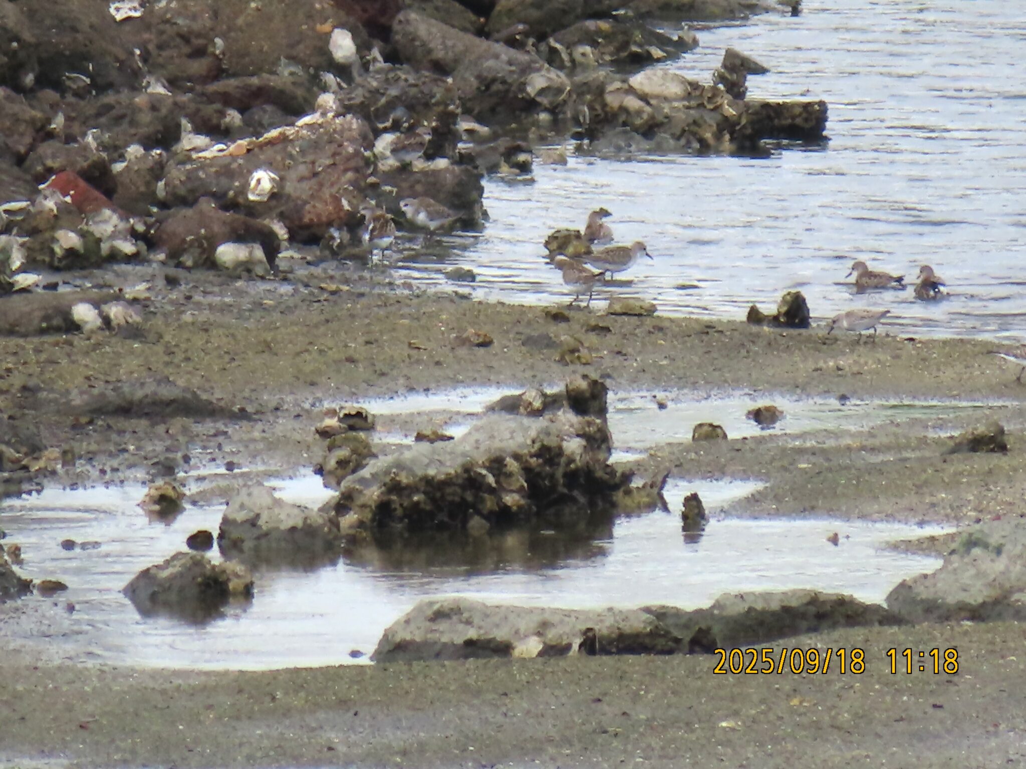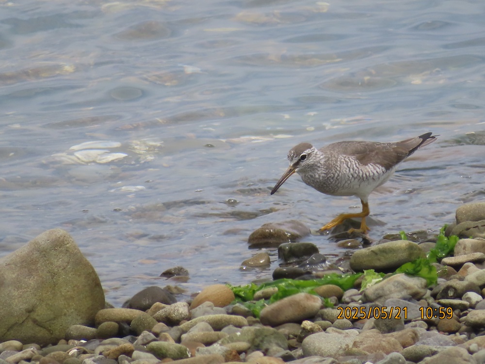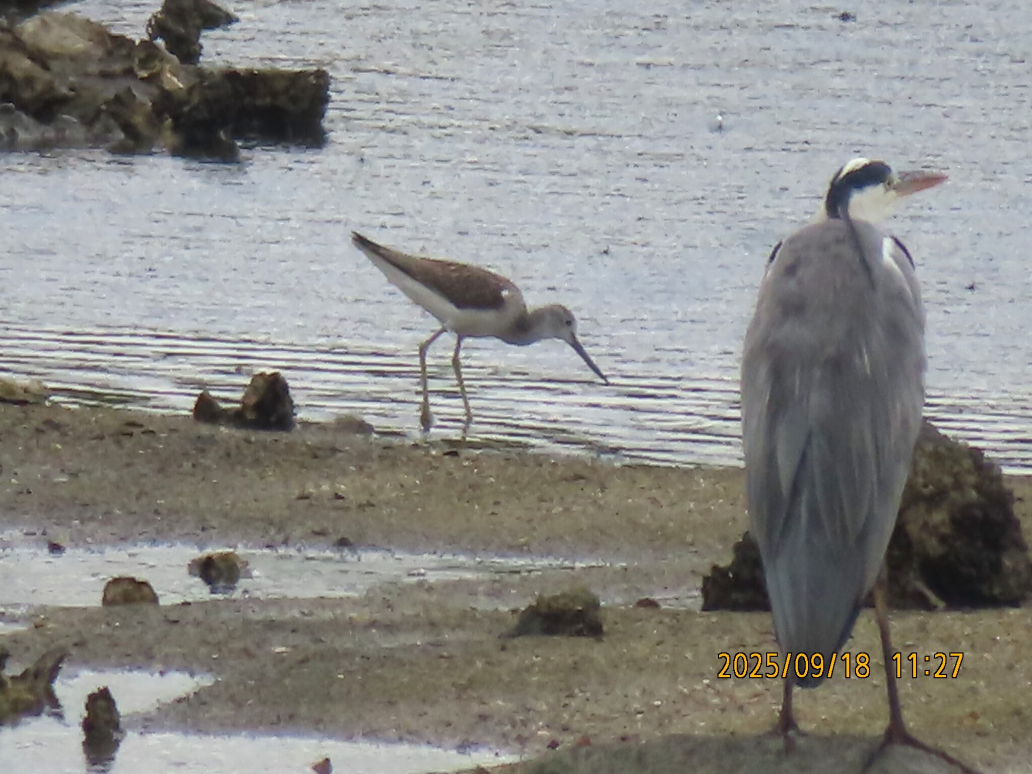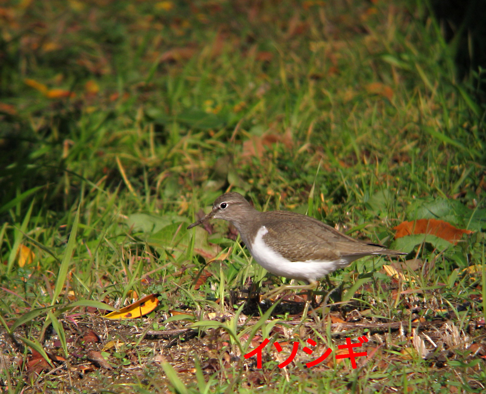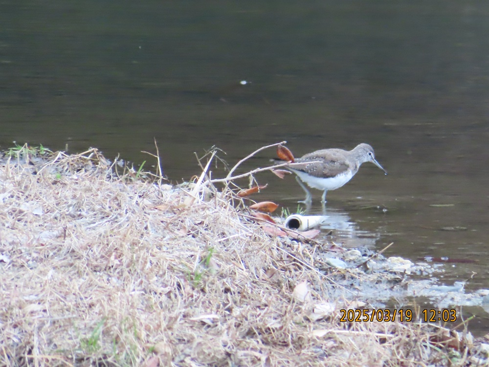 イソシギとクサシギはとても似ています。観察の機会が多いのはイソシギです。今回はクサシギを十分に観察出来ました。イソシギは留鳥として一年中観察できます。クサシギは主に春と秋の渡りの時期に見られる旅鳥、もしくは冬鳥として観察されます。一番の違いはお腹の白色部がイソシギは上のほうに切れ込んでいることです。クサシギには切れ込みはありません。又、クサシギの背中には白い点がいくつもあり、イソシギにはありません。飛翔時も違いがあります。飛ぶとクサシギは尾が白く、イソシギは白い翼帯が目立ちます。(M.S 写真 M.S & Y.S)