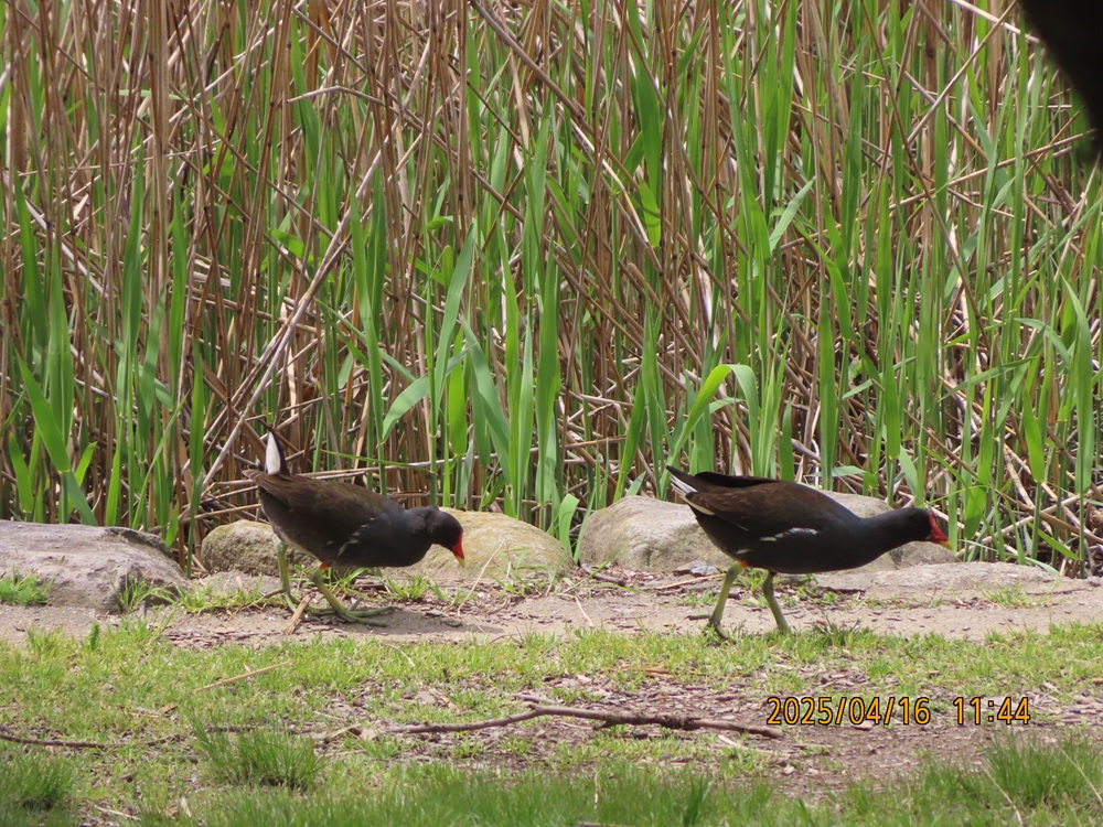小鳥の森である水流エリアに入るとシジュウカラやメジロが飛び回っていた。と突然にカワセミが視界を横切り止まってくれない。加呂登池までの森林間ではシジュウカラの鳴き声が続き、シジュウカラと思いきやアトリの群れが・・・樹木々を飛び回るアトリは新緑に遮られ観察するのも大変だ。加呂登池に着くと池の沿にペアと思われるバン2羽とカワラヒワ数羽が草むらで餌食中、それをゆっくり橋上から観察。そのこたちを刺激しないよう遠回りで池に降り昼食タイムとなる。