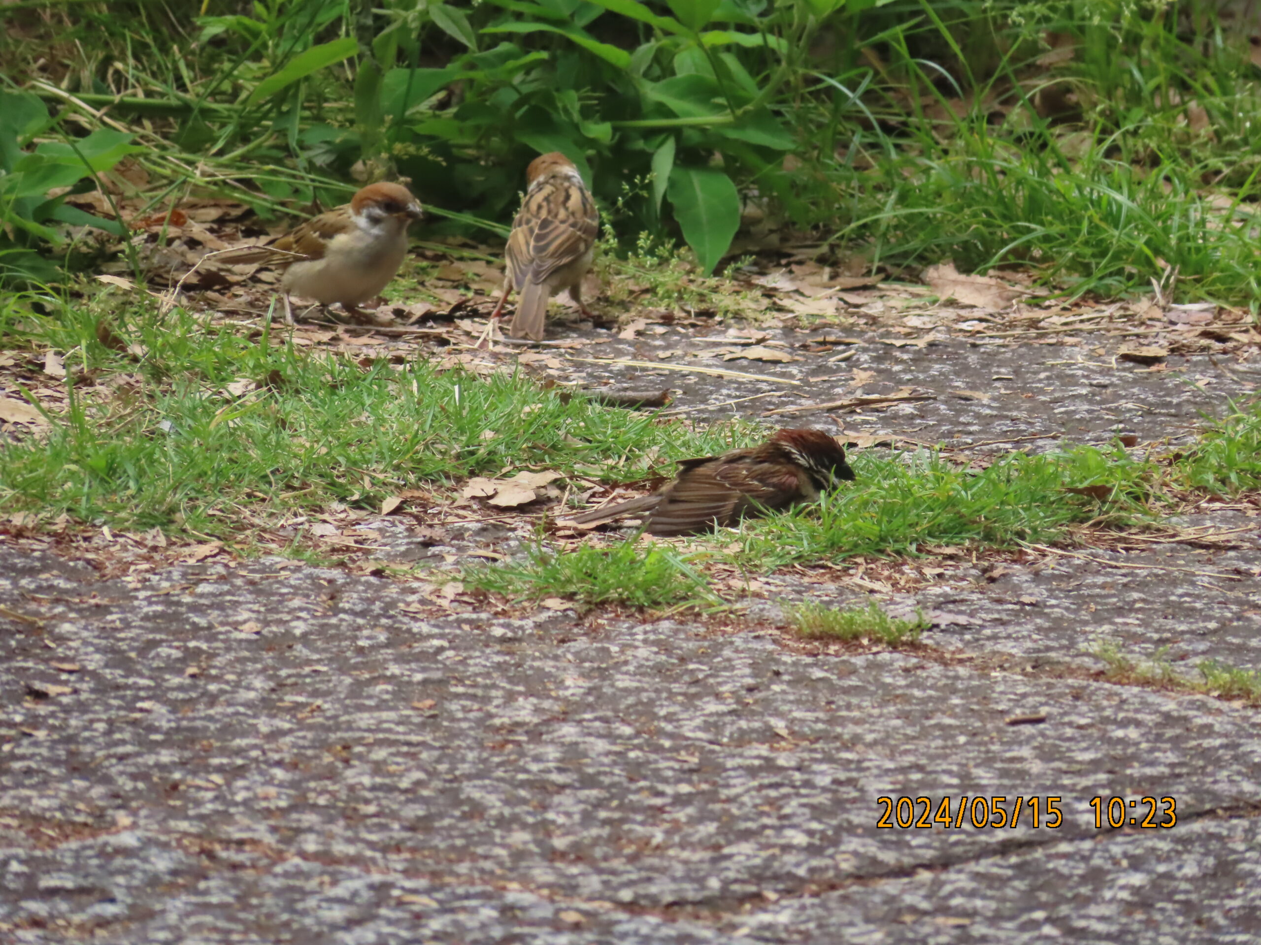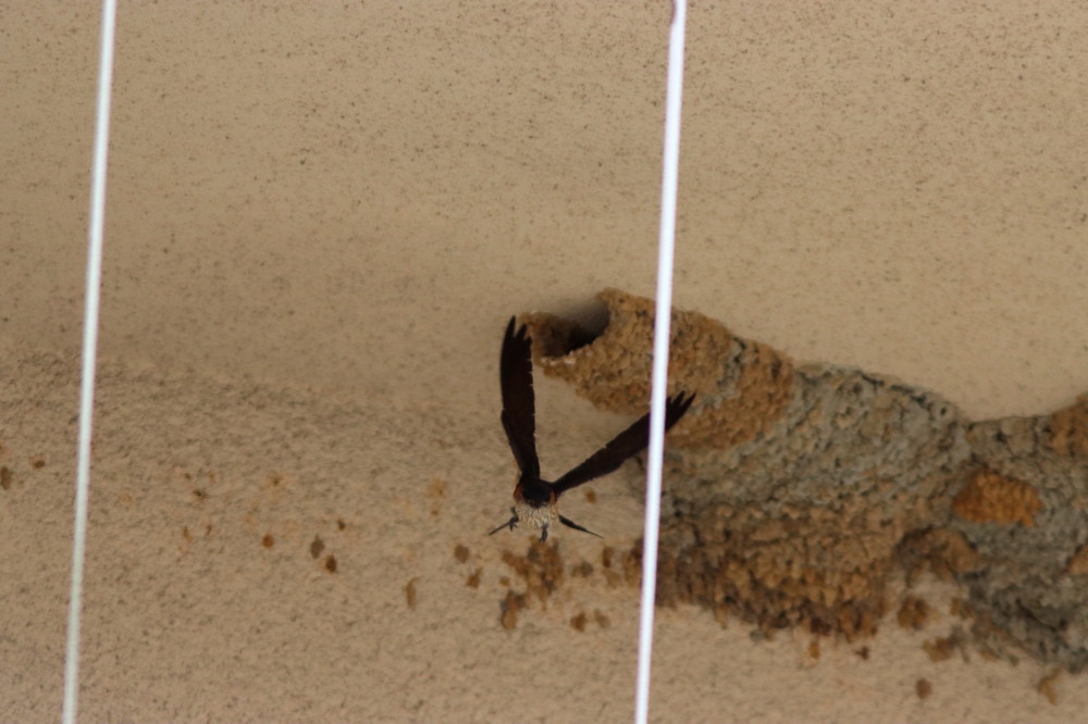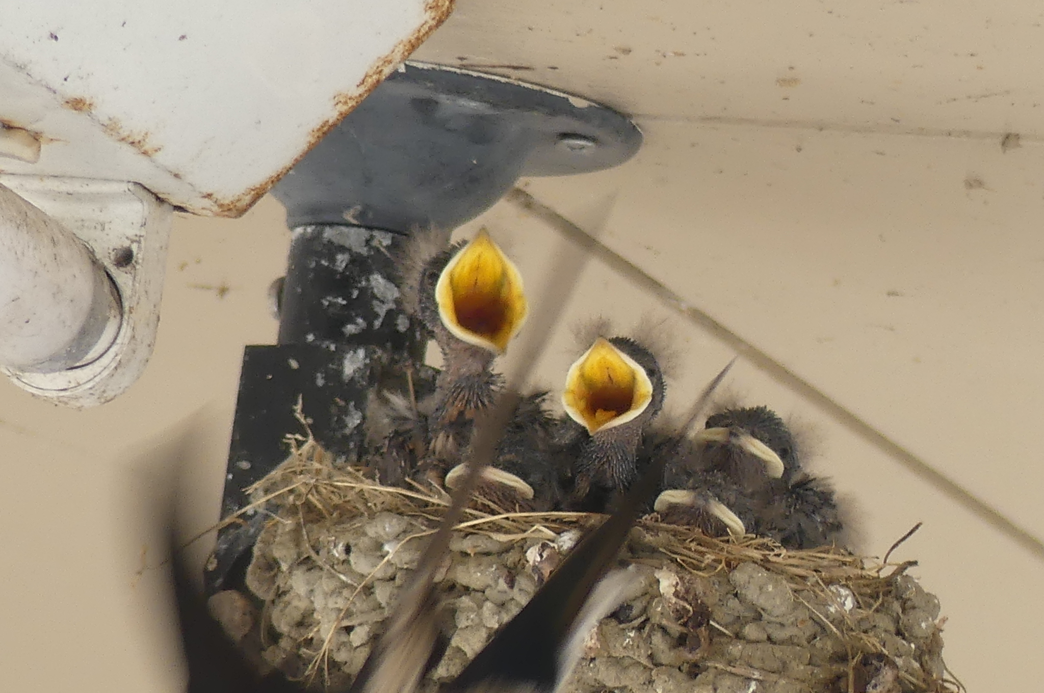 好天気に恵まれる、暑さはそれほどでもなさそうだ。3年続けてのヤマセミ観察を目的とするこの場所、さて3度目の正直となるか、リーダーのIさんが昨日の下見で「出ましたよ」の一言に、一同期待を膨らませて榛原駅前をスタート。先ずは駅近くの民家軒先に育雛中のツバメ、コシアカツバメを観察。空では多くのツバメが飛び交うが、その速さに両者の見分けがつきにくい。目的の「こどものもり公園」までは2.5キロの距離、宇陀川を下流に沿って歩く。川は昨夜の雨でかなり増水している。川の中ではハクセキレイ、セグロセキレイ、キセキレイの3種のセキレイが同時に出現。墨坂神社前の川に架かる歩道橋の回りではイワツバメが数羽、桁下に巣があるようだ。空ではトビが数羽が舞い上がっては、何度もハシブトガラスの攻撃に合い逃げ回わる。道中、ホオジロ、シジュウカラ、イソヒヨドリの姿やウグイスの声を聴きながら到着。