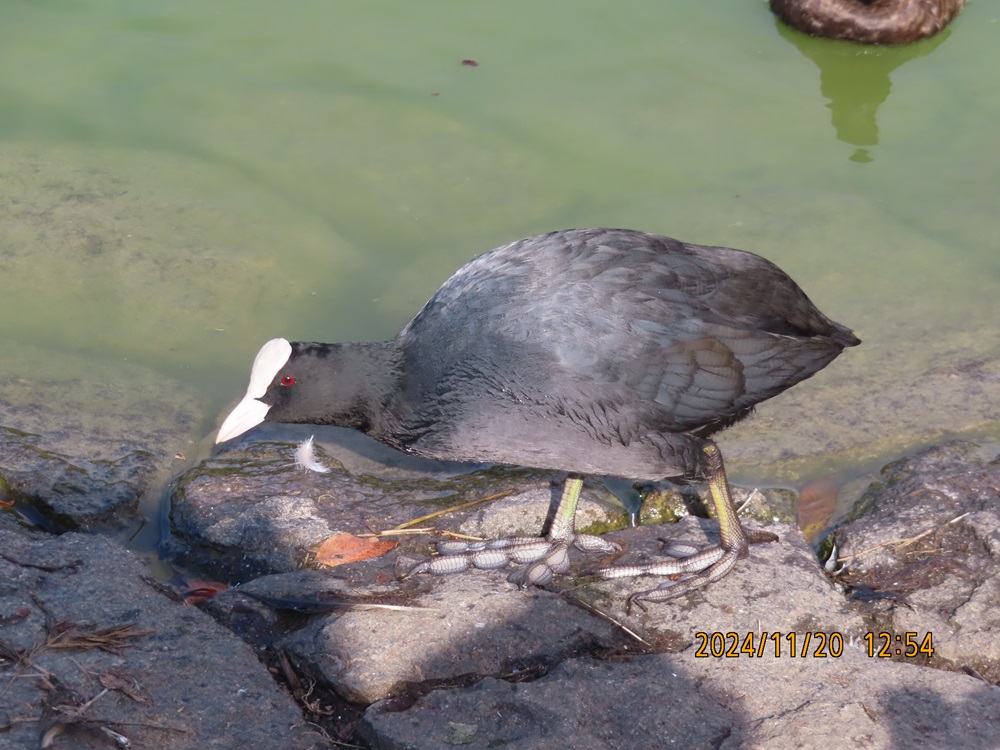 今回のハイライトはオオバンです。オオバンはカモ類ではなくクイナ類です。通常オオバンは水面にいて足を観察することなどめったに無いのですが、今回は、陸上でしかも至近距離でじっくり見ることが出来ました。オオバンの足は身体のわりにデカイ、爬虫類みたいな鱗があることにびっくりしました。カモ類は、足の指と指の間にミズカキがあり、指同士がミズカキでつながっています。オオバンは指の一本一本にミズカキがついています。このような足を弁足(べんそく)と言います。この弁足が閉じたり開いたりして、水中を泳いだり泥の上を歩いたりします。弁足の弁は「花弁」の「弁」と同じような意味です。花びらのような薄い切れ端を意味します。足を後ろに蹴るときは弁が開いて水をとらえ前に出すときは抵抗を減らすために弁はたたまれています。(カイツブリ類も弁足だそうですが足をじっくり見たことはありません。)(M.S 写真K.T)