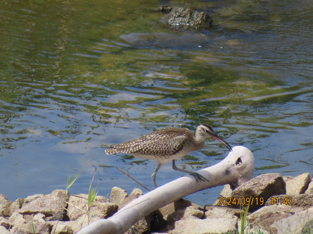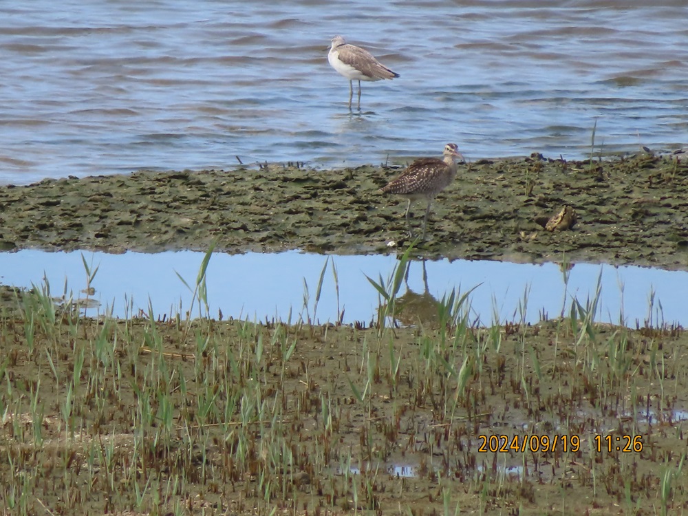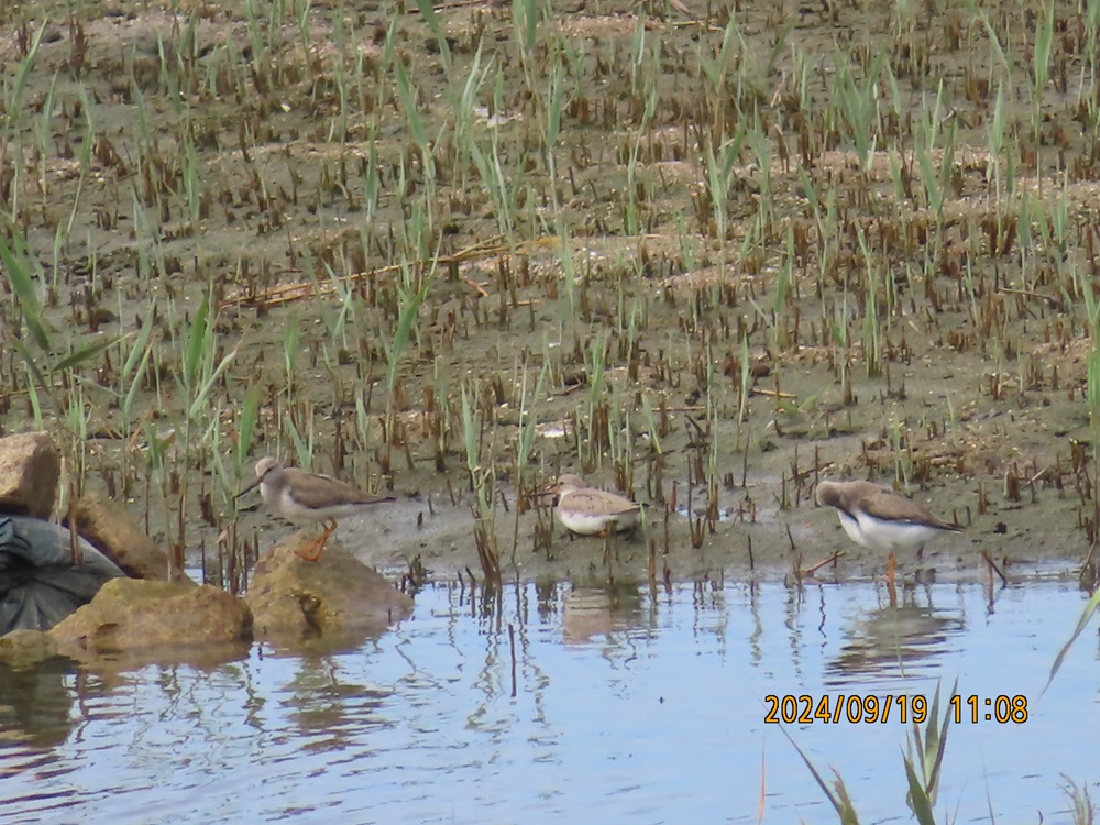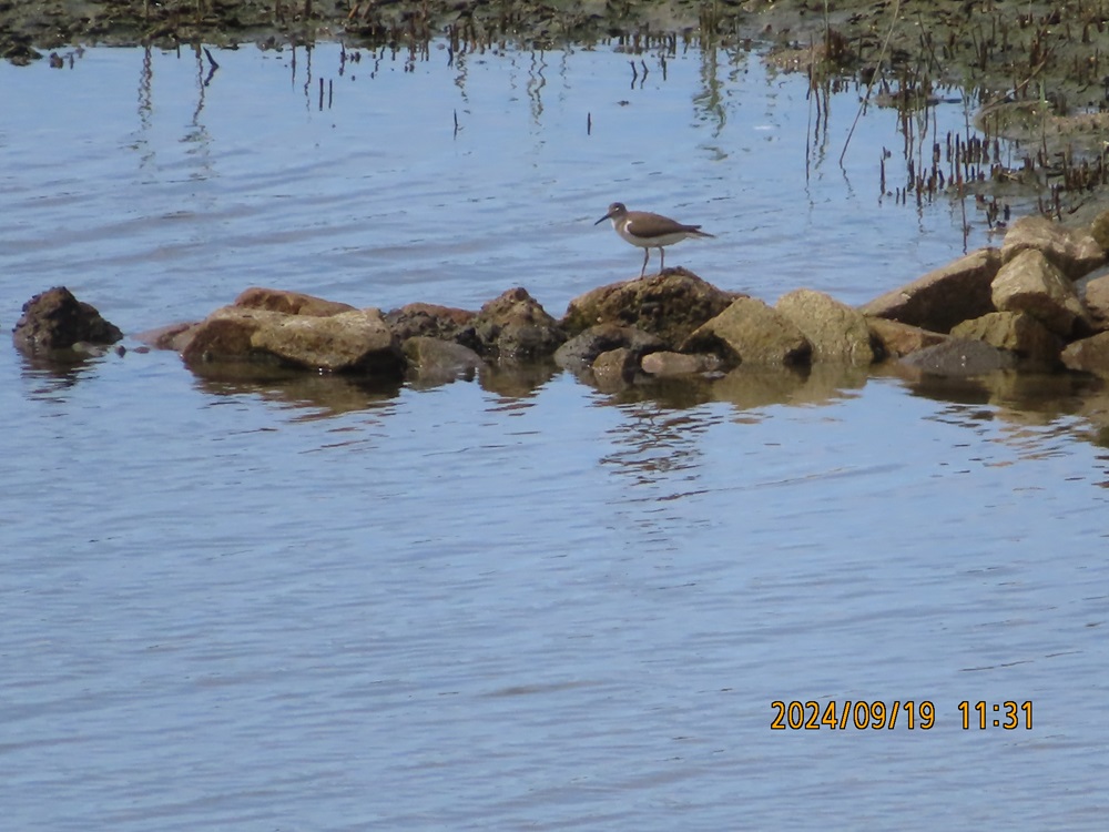 徐々に潮が引くにつれ水際にシギ類が現れだした。激しく動き回る小型のイソシギ、トウネンや中型のキアシシギ、アオアシシギ、アカアシシギ、ソリハシシギに交じって大型のチュウシャクシギまで、しかし何れも遠方のため、双眼鏡での観察が難しく、望遠鏡を使ってどうにか確認する。周りのダイサギも水の引くのを待って浅瀬に集まりだした。館内にはもちろんエアコン設備は無く、各自の暑さ対策も全く役に立たないほど・・・・額から汗がしたたり落ちる。しばらく館内からの観察を続けるが、キリアイの出現を最後に1時半ごろに早めの鳥合わせとなった。