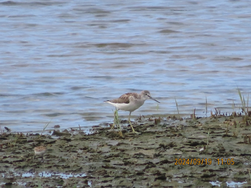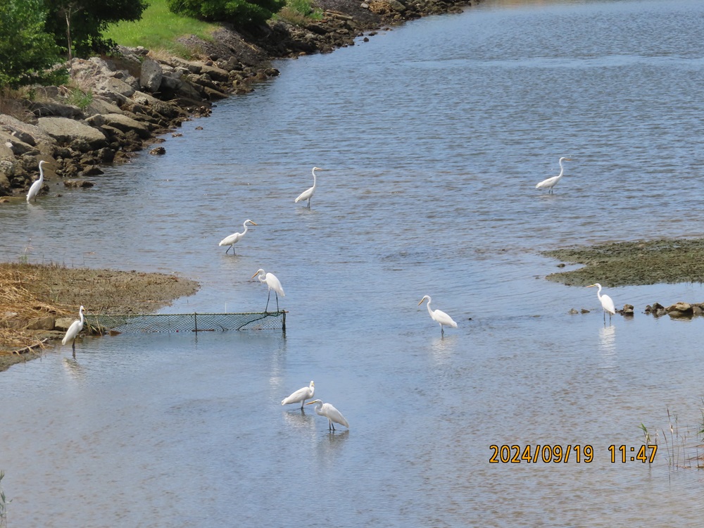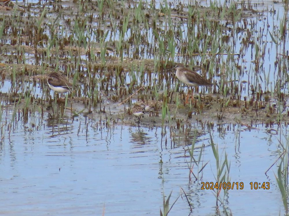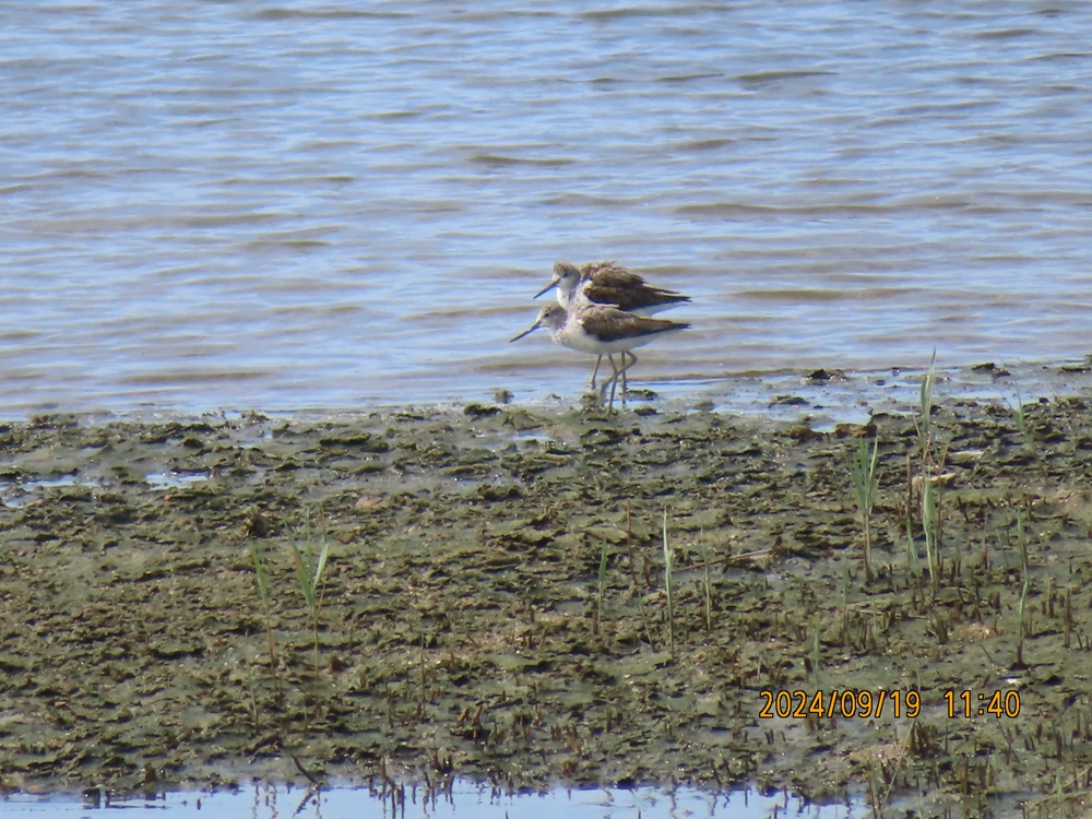 9月半ばを過ぎたというのに大阪市の天気予報は35℃という異常なまでの暑さを伝えている。しかしこの時期はシギチドリ等の渡り鳥を観察するベストシーズン、今日は干潮時間も午後2時頃と絶好の機会でもあり思いのほか多い15名の参加になった。展望塔館に入ると、もはや観察窓近くの席は空いてなく、やはりこの暑さでも何時もより人は多い。周りの水面ではカルガモの集団、カワウ、マガモが見られ、ミサゴ2羽が水面の各木杭に止まったまま動かない。空ではトビが3羽旋回している。池沿いの樹木上、下では多くのダイサギ、アオサギ、コサギが羽を休めていた。