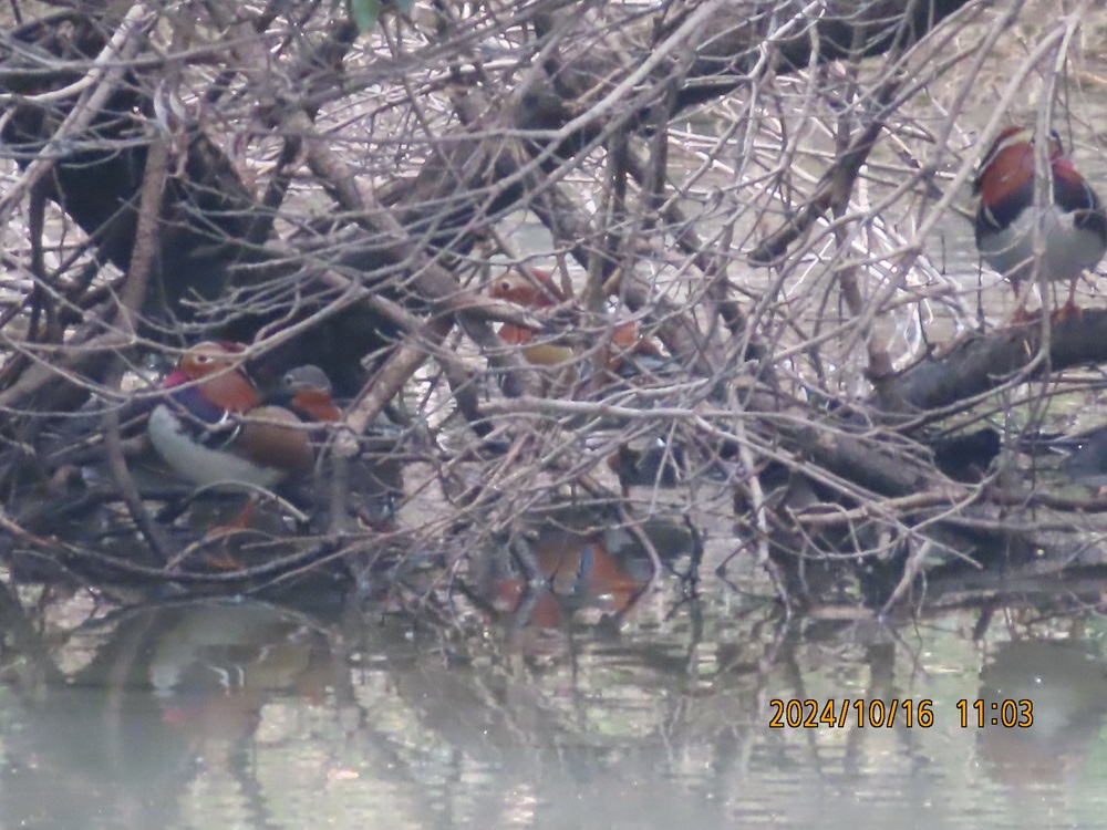 次に上石津ミサンザイ古墳(履中天皇陵古墳)に移動。観察台からは堀の水面はカイツブリを除いて水鳥の影がなく、さらに堀に沿って右奥へと歩を進める。途中ハイタカが我々の頭上に、そして松の木に集まる数羽のビンズイに「初めて見た」と大勢の歓声があがる。古墳、中ほどのいつもの観察スポットからは、やはりいました樹の陰に複数のオシドリがそしてミコアイサやホシハジロ、マガモ、水鳥が次々と列となって目の前を通り過ぎる。始めは種毎に行動していたが、そのうちに多種のカモと水鳥が仲良く一つの固まりとなって、水鳥たちの楽園の世界を見せてくれた。おまけに対岸には食餌するミサゴが。それら鳥たちのショウに暫く全員釘付け!・・・・・そして皆が充分満足した後に「鳥合わせ」となり解散となった。 帰り道でのコゲラの声が加わり観察週数は34種と今年一番の数に・・・。(M.K 写真K.T)