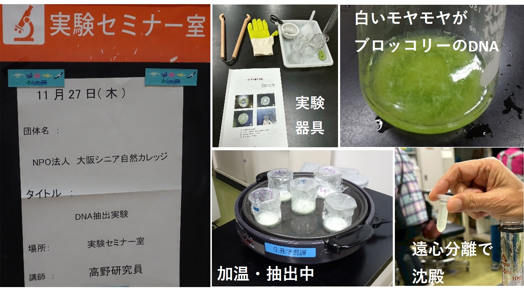 兵庫県立「人と自然の博物館」に移動し、2班に分かれDNA抽出実験と展示見学です。抽出実験はブロッコリーを細かく刻み、界面活性剤を加えてすりつぶして、ろ過・加温抽出後にエタノールを加えて冷却・析出すると、白いDNAがフワフワと出てきました。簡単な実験で科捜研の女になれた気分でした。博物館には震災、地層、恐竜、動物、植物、鳥、昆虫、きのこ、霜柱…と、非常にたくさんの見ごたえのある展示があり、公立博物館最大級といわれるのは納得できるものでした。昼食後、博物館の自由見学の後、バスにて帰路につきました。バスの中では多くのみなさんがお休みになるほど充実し、楽しめた2日間でした。