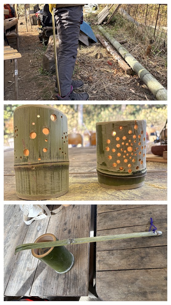 午後は竹工作の体験。講師より丸い竹では一輪挿し、竹灯籠などができる、割った竹では靴ベラ、孫の手などもできるとの見本の説明があった。竹割、竹の削り方、竹の曲げ方、ドリルの使い方などの説明を聞き体験もした。その後、皆で自由にお目当てのものを作り始めた。講師の皆さんの手助けを得ながら、一輪挿し、花立て、竹灯籠、孫の手、靴べら、料理用竹べらなどが出来上がった。