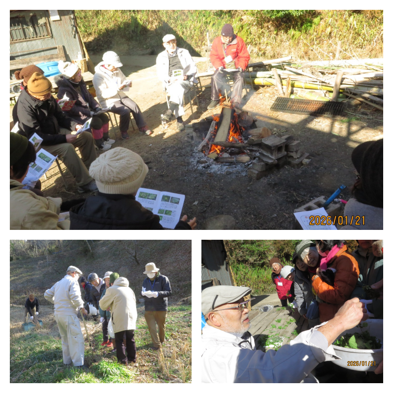 大寒の翌日の寒い中、奥の谷に集合。焚火の周りに腰掛けて講義が始まった。日差しもあり心地よい。講義は「春の七草」の紹介とその薬効についておもしろく説明があった。「七草粥」の原型は平安時代に中国から伝わったことも知った。芹、薺,御行(ハハコグサ)、繁縷(ハコベ)、仏の座(コオニタビラコ)、菘(カブ)、蘿蔔(ダイコン) これぞ七草。