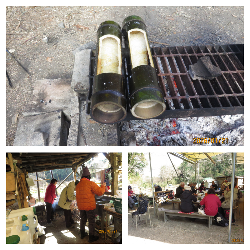 昼食時はお粥体験。羽釜を薪で炊き上げた小豆粥(七草入り)は実においしい。同時に竹で作った飯盒で炊き上げたご飯も試食した。竹の香りがほのかにし、おいしくいただいた。