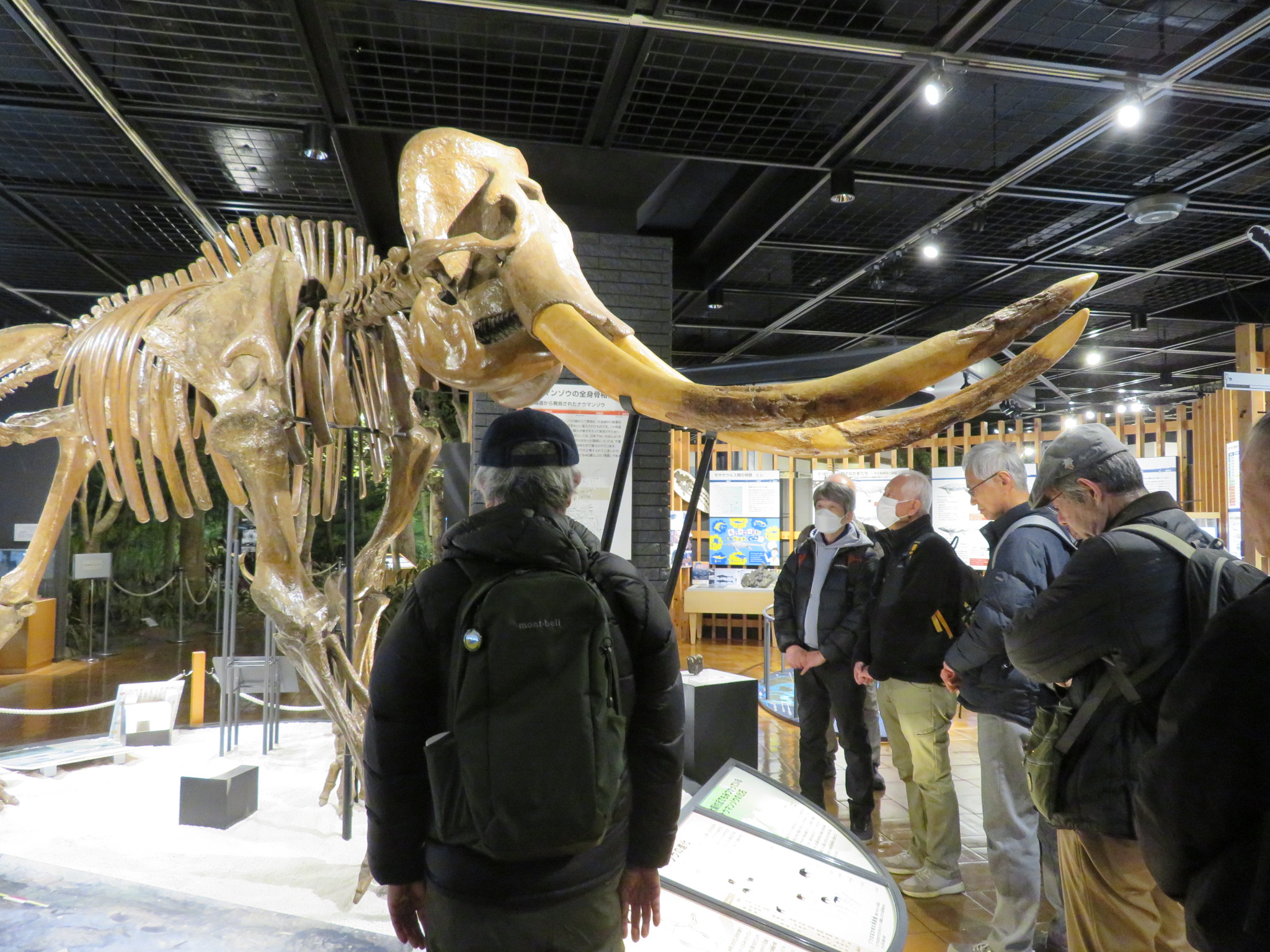 今日の講座は資料館2階の展示室の見学から始まった。ナウマンゾウ・キシワダワニ・モササウルスなど古代生物の標本を見ながら詳しく解説して頂いた。また、近辺の地層や地質のパネル、アンモナイトの化石などもあり、午後からの実習に期待が膨らむ。その後、資料館は工事中なので、座学と実習をする為に近くの公民館に移動した。