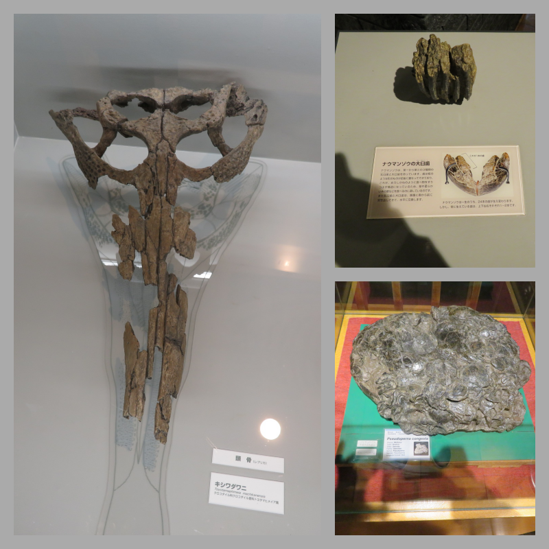 左:キシワダワニ 右上:ナウマンゾウの歯 右下:アンモナイト
