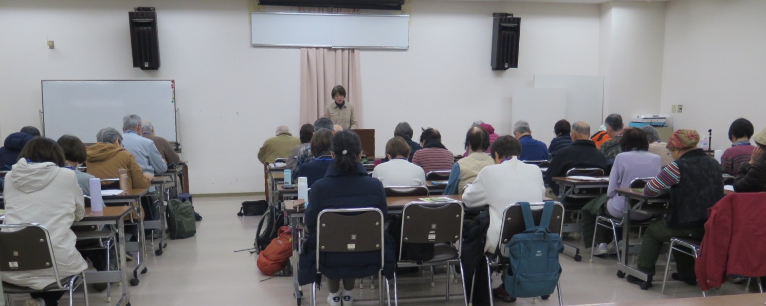 本日の講座は、大阪府立花の文化園に集合。全員そろってゲートをくぐると、パンジー・ビオラなど色とりどりの花が迎えてくれた。準備された研修室に入り講座が始まった。