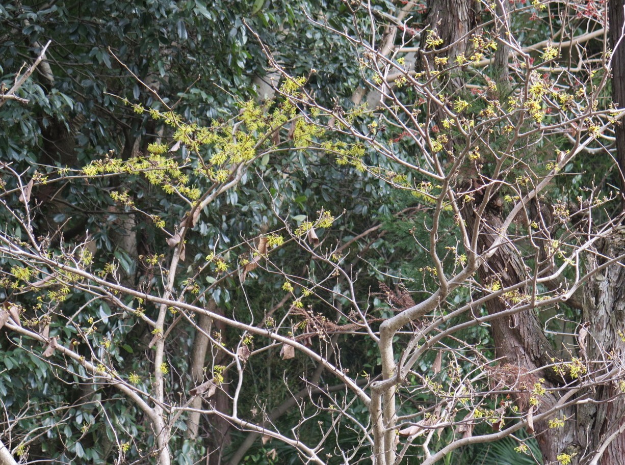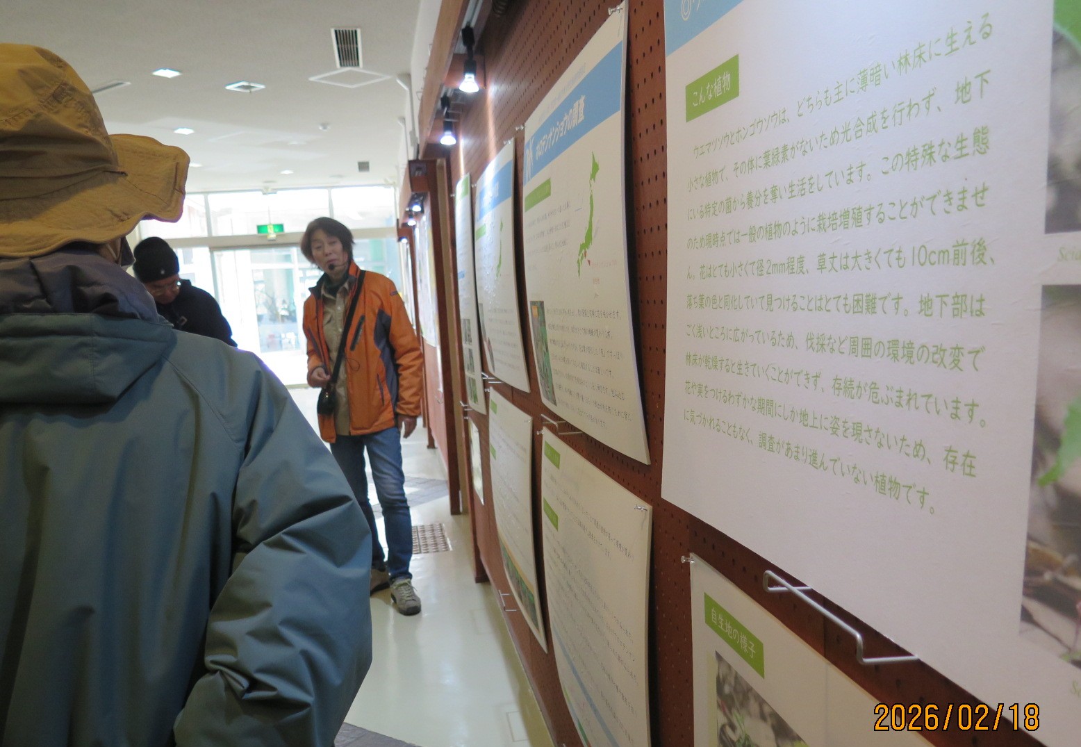 講義の合間には、樹木の葉の付き方、葉の形、肌触りなどで種類を特定(同定)する実習もあり、多くを学んだ講義であった。 午後からは、園内の展示室にある紀伊半島に自生するジュロウカンアオイ、ホロテンナンショウ、ホンゴウソウ、ウエマツソウの「生息域内保全」のパネルの前で、保全の苦労を聞き感銘した。その後、園内のガイドウォークをしていただいた。植栽された花・樹木、早春に咲くセリバオウレン、バイカオウレン、ユキワリイチゲなどのコーナーでは、説明に耳を傾ける人、じっと眺める人、写真を撮る人、それぞれの楽しみ方で園内を歩いた。暖かい日差しにも助けられ、楽しく、有意義な講座を終えた。 (M.A)