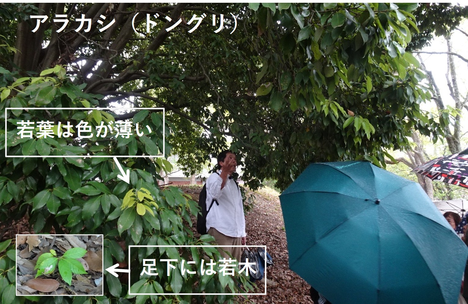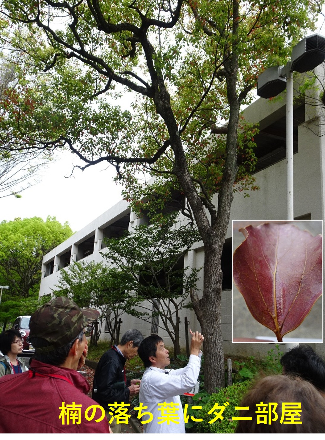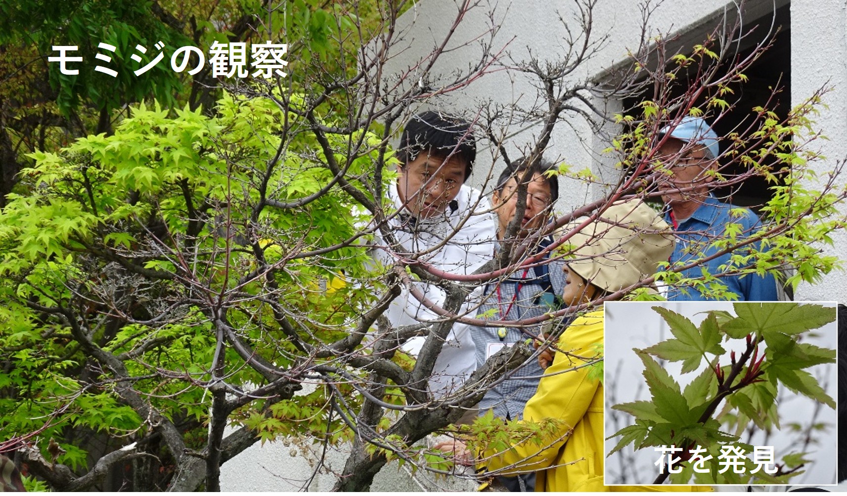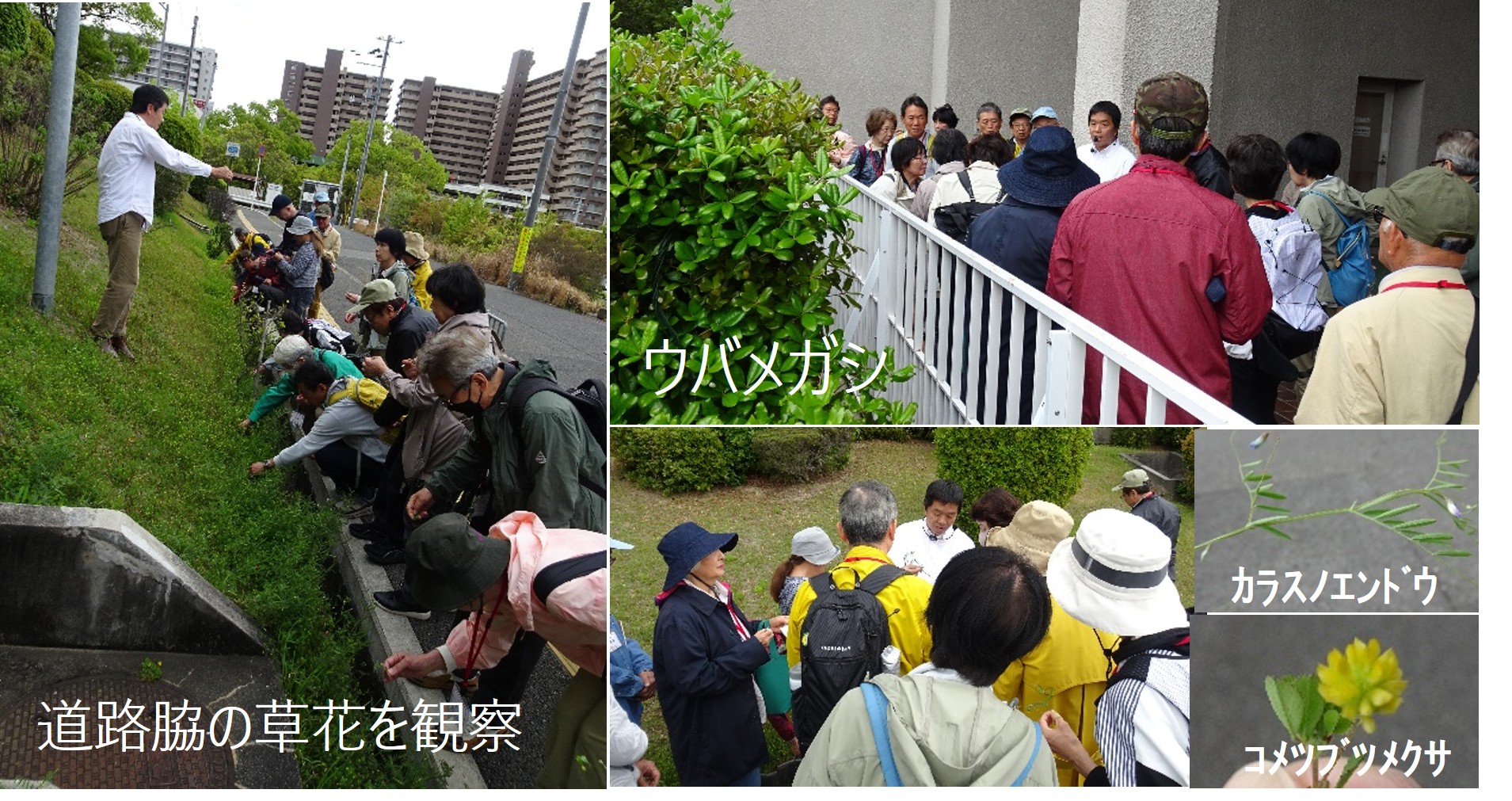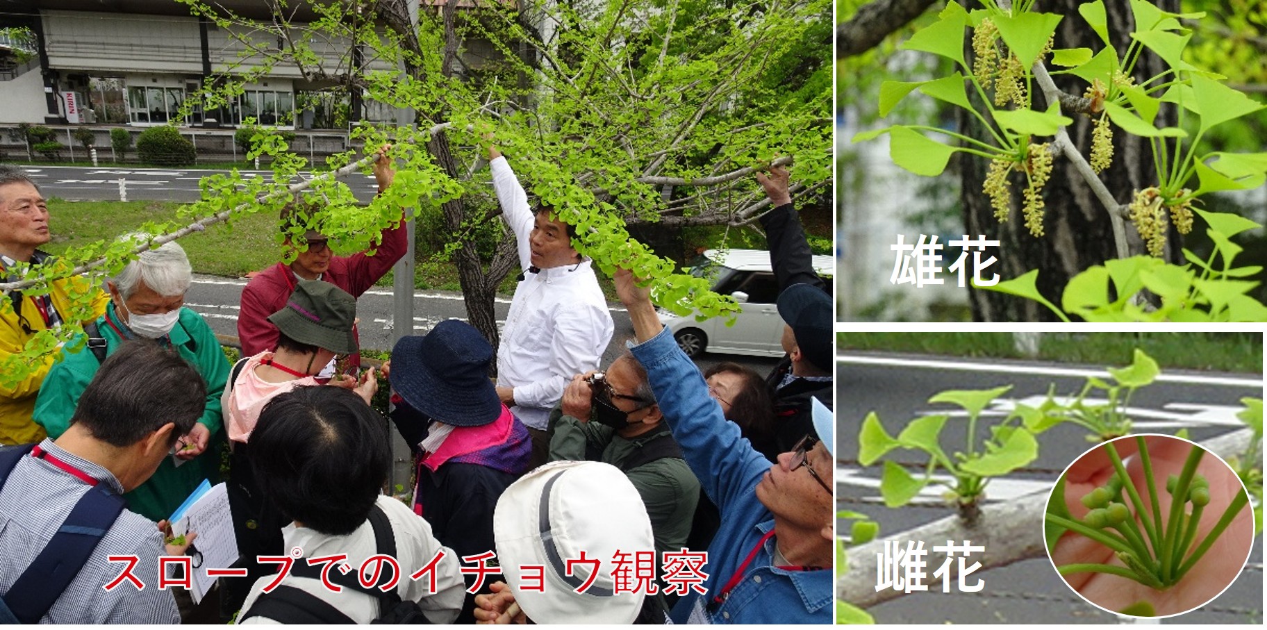 会館まわりの植え込みのウバメガシの葉(形・色)、道ばたの黄色の花(コメツブツメクサ)では花びらの数やその付き方、カラスノエンドウでは葉の付き方・枚数、豆やツル状の枝先などを手に取りながら観察しました。去年まで樹木があった桜の切り株や光合成(生産者は植物のみ)の話、イチョウの雄花と雌花、イヌシデ、モミジの花、楠の落ち葉からダニ部屋・樟脳の匂いなど、様々な植物・生命を観察しました。みんな新たな発見、知らなかったことの多さを感じながら午前は終了しました。