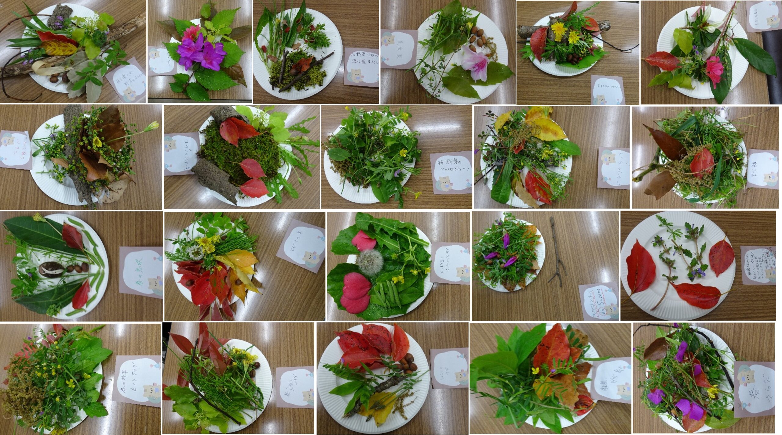部屋に戻ると、各自「自分なりの料理」の作成です。様々な個性ある作品を作り、お互いに見比べました。作品を通じ、先生からこれからの講座での自然観察に生かすため、①自分なりの見方を身につける、②見つけたことを人に話す、③出かけて身の回りの自然を楽しむ、ことができるようになることに期待を述べられました。さあ、次回の講座から生かせるかな?(Y/M)