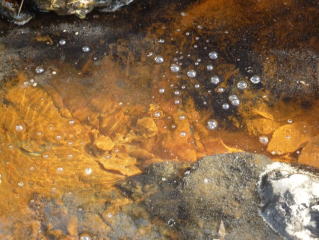 まず案内されたのは柱状節理。火山岩のなかでもかんらん石を多く含むという。わざわざ玄武洞まで行かなくてもここでしっかり観察できる。鳥地獄を彷彿とさせる炭酸泉が湧き出るところも観察した。次に石ころ観察、各自3種類以上のものを見つけ、先生に尋ねて回る。1500万年前の火山活動の名残が随所に感じ取れた。インブリケーション(石ころの規則正しい配列)、川の蛇行する姿を見て攻撃斜面やポイントバーも認識できた。