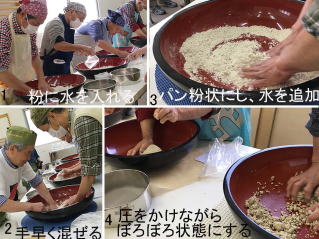 手打ちそば体験I。 水量が大事。手早く均等に混ぜる。