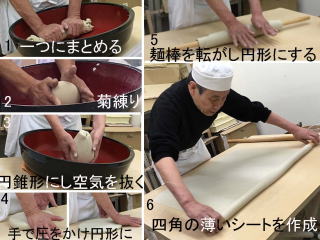エプロンをし、三角巾を着け、よく手を洗い、準備万端。まずは先生の手技をよく観察。そば打ちは「1,はち2,のし3,包丁」と言って“水回し”と“こね”の行程が最も大切なのだそうだ。粉をふるい、よく混ぜて、水を3回に分けて入れる。指を立て、大きくまわして水を均一になじます。水量は粉の半分、その60%を最初に入れる。続いて20%、最後は加減を見ながら残りの水を。最初の水量を少なく間違えると、堅く、割れやすい生地になってしまう。その後のこねる、のばす、切る、すべての段階で、堅すぎと言われてしまった。