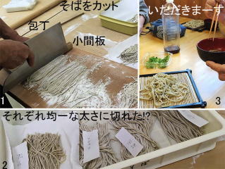 大いに助けてもらいながら、何とか切り終え、5つに分けて紙にくるんだ。そのうち一つは試食用、ざるそばに。少々太めではあるが、歯ごたえ、のどごしは良く、まずまずかな!家に持ち帰り、今度は釜揚げで。“まあまあ、できてるやないか”と主人に褒められ、よかった!!