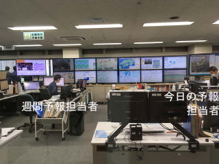 現業室:天気予報。今日の予報担当者(右)と週間予報担当者(左)が作業中