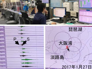現業室:地震監視。下図:1月27日の大阪地震データ。各観測所で得られた、P波とS波の時間差をもとに円を描き、それらの交点(赤)が震源地