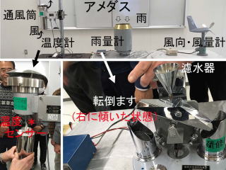 アメダス装置。温度計:上部にファンがあり下から上へ通風。雨量計:雨が濾水器を通り転倒ますに落ちる。一定量になると、ますが傾き排水。
