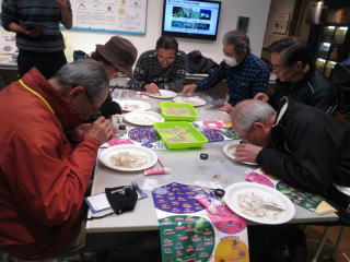 チリメンモンスター探しと資料館の見学、館内には岸和田の自然に関連する物や世界の動物のはく製など多くの資料が展示されていて、なかなか見応えがある。そしてワークショップは、チリメンジャコの中に潜む、本来なら捨てられる運命にあるモンスターを見つけ出す。カタクチイワシ以外の魚やカニ、エビの幼生、タコやイカの赤ちゃんなど様々なモンスターを探し出して、ルーペ・顕微鏡でしっかりと観察した。