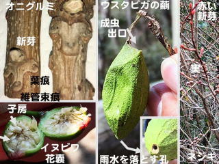 冬を越す動植物の様々な顔。オニグルミ:ヒツジ顔?サル顔?