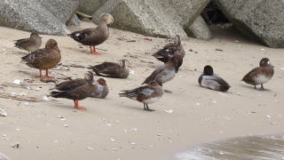 砂浜でくつろぐカルガモ、コガモ、マガモ、ヒドリガモ、スズガモ達