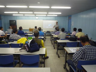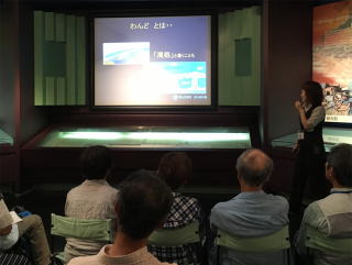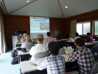 ウミホタルは海に棲むミジンコの仲間、大きいもので3mm、暖流が流れる海域で塩分濃度(約3.5%)が保たれている浜辺に生息。ウミホタルが大阪湾に生息するようになったのは大阪湾の水質が良くなってきたことの証。昼間は砂の中で生活、夜間エサを求めて活動、魚の死骸など食べる海のお掃除屋さん。発光物質(ルシフェリン)は体内では黄色であるが、上唇腺から海水中に放出されると酸素と反応し鮮やかな青色に発光する。発光目的は求愛と捕食者からの回避である。・・・等々、山田先生のパワーポイントを使った講義で沢山のことを学んだ。