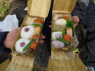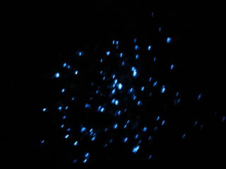 各自手作りで用意したガラス瓶やペットボトルにソーセージや竹輪などの餌をいれ、仕掛けの準備完了。少し腹ごしらえをしてウミホタル捕りにいざ浜へ。仕掛けの容器を海底に沈め、約20分。それとなく仕掛けの紐を引き上げると青く光るものが、容器を揺らすと更に光る。容器の海水を地面に撒くと辺りが満天の星空の様。しばらく鮮やかな青い光芸術を楽しんだ。