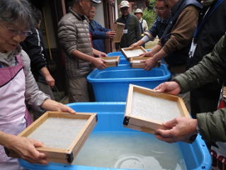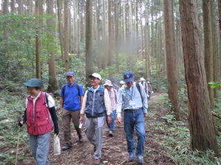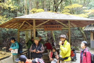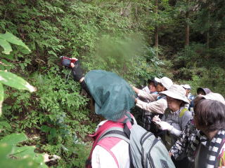 係員の指示に従ってその場を通過して、幕末に天誅組が五條代官所を襲撃するために千早峠越えた歴史的道、五條林道へ。以前の雨の影響で荒れた道や土砂で谷が塞がれ道に溢れた水が流れる部分を通り過ぎると、比較的平坦で歩きやすい静かな道が続く中での観察となった。