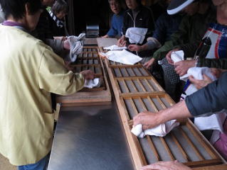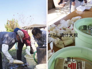 大きな大根はからし漬け用に。みんなで力を合わせ、洗って、切って容器に並べ、調味料を入れ、重しをして完成。2週間もすればきっとおいしいからし漬けに!!
