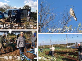 力強く、頼りになる10期男性達。収穫後の土作りに働く。空は青く樹木先端にはチョウゲンボウが光る