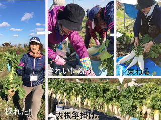 良く気がつき、働き者の女性達。力を合わせて大根の収穫。たくあん用大根干し。並んだ真っ白な大根:いつか見た風景。
