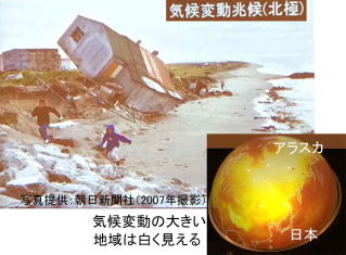 気候変動の兆候。北極では永久凍土の融解と海岸浸食が続き、家屋が倒壊