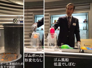 液体窒素(−196℃)の効果。右:ゴム風船。空気冷却で体積縮小。中:ゴムボール。極低温で凍結。弾性を失う。左:容器に落とすと破裂