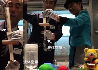 シャボン玉の実験では小学5年生を対象とした実験とのこと。我々も還暦を過ぎて子供に還る。久々にシャボン玉を飛ばし、楽しいね!ドライアイスをおいた容器の上ではシャボン玉が落ちてこないことを確認。CO2は空気より重いことを視覚で感じた。さらにCO2が酸性雨や地球温暖化をもたらすことを示す実験。pH指示薬BTB液や温度計を用いて確認した。−196℃の液体窒素を用いるといろいろなことがわかる。液体窒素の中に膨らましたゴム風船を入れると、空気が冷えて体積が縮小。しぼんでしまう。一方、ゴムボウルを入れると、カチカチに凍り、落とすと瞬時に破裂する。極低温でゴムの物性(弾性)が失われ、堅いプラスチックのように、落とすと割れてしますのである。液体窒素内に試験管を入れると空気が冷やされて液体空気ができる。試験管を液体窒素から取りだし、直ちに、火を付けた線香をいれると火が消える。しばらく室温で温めた後、線香を近づけると線香が赤くなる。酸素が発生したためである。
