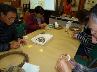 本年最後の講座は堺ふれあいの森でのネイチャークラフト。自然の素材を使って、各人各様、思いのままに工芸に取り組もうというもの。