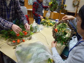 少し遅めの昼食後、あらかじめ準備した蔓のリースをベースに飾りつけスタート。中には自分で採取した蔓からリース作りを始める人や、飾りつけにリボンを持参する人も。各人それぞれのコンセプトで仕上げへ。最後に発表会。個性豊かな作品のプレゼンテーションの中に人それぞれの魂が感じられた。