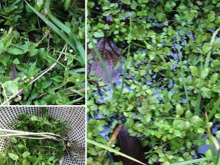 ハコベやセリは大量に収穫。一緒にノビルもザルに入れて