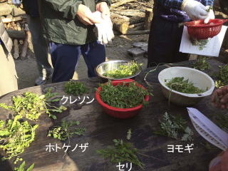 まずは周辺のあぜ道や小川での七草摘み。ハコベラ(ハコベ)、セリは大量に生育。スズナ(カブラ)、スズシロ(ダイコン)は畑で栽培された物をいただく。ホトケノザ(コオニタビラコ)はやっと何とか見つけた。ナズナ、ゴギョウ(ハハコグサ)は?季節が進み、成長すると簡単に見つけることができるのに!