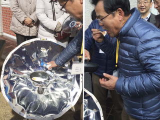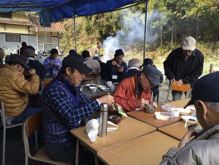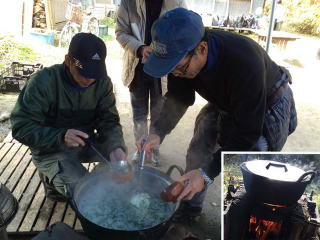 大鍋に米、水を入れ、かまどで炊く。途中根菜を、最後に刻んだ菜、調味料を入れて、できあがり。湯気が立ち上り、おいしそう!!