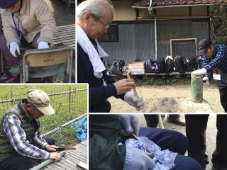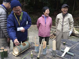 熱々の緑野草豊富なお粥を食べたあとは伐採してきた竹を用いて、竹の工作。竹箸、ぐい飲み、一輪挿し、竹へら、植木鉢など。自分のため、あるいは愛しのおかあちゃんを喜ばそうと思い思いに作製。のこぎりで切り出し、なたで割り、キリで孔を開け、ナイフで細かな細工を施し、サンドペーパーで美しく仕上げた。自分の作品に大満足。お年玉をもらったみたいで、笑顔がこぼれ、今年はいい年になりそう!!